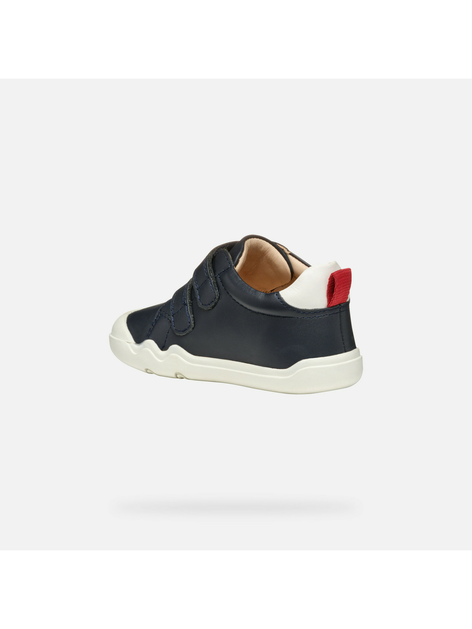Stylové tmavě modré chlapecké tenisky Geox Steppieup představují dokonalou kombinaci pohodlí a praktického designu. Vynikají dvěma praktickými suchými zipy pro snadné obouvání, přičemž horní pásek nese logo značky. Bota je doplněna světlou podrážkou a špičkou, společně s červeným poutkem na patě pro snadnější nazutí.