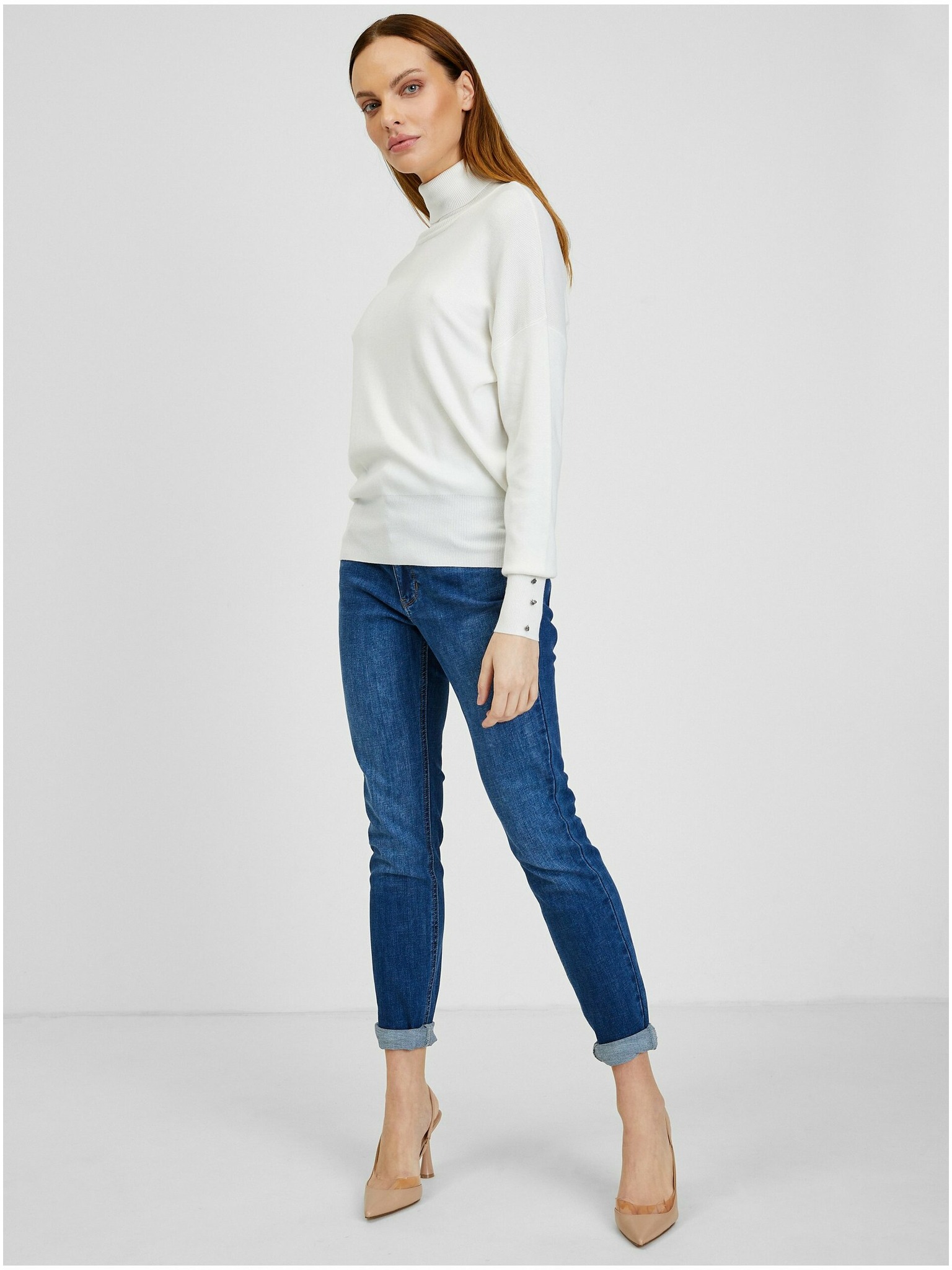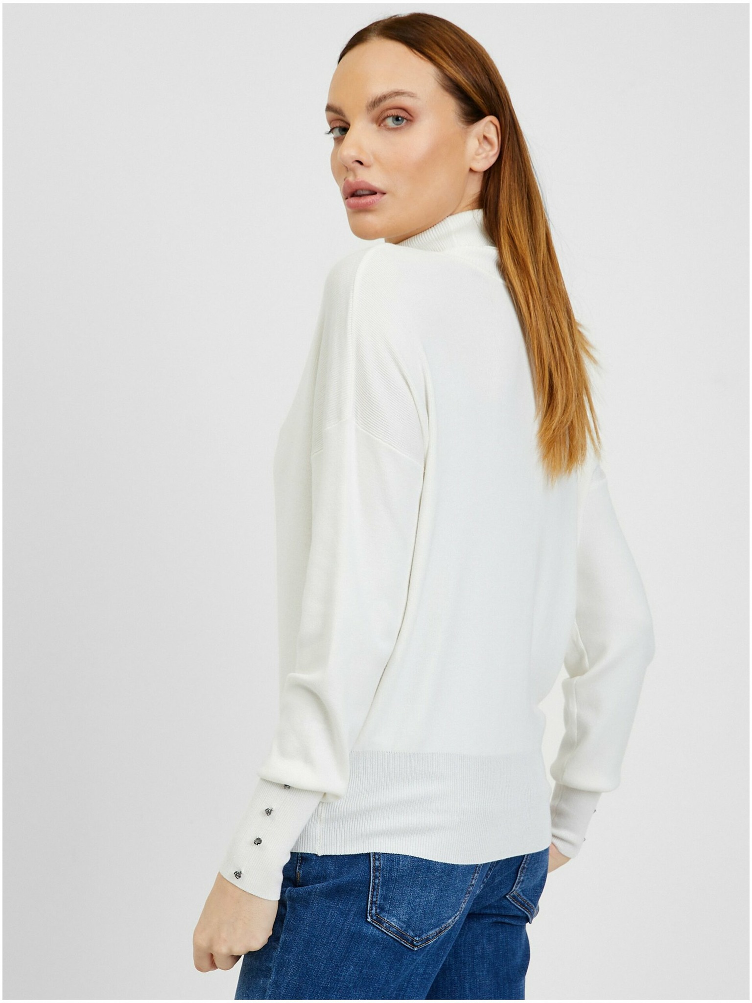Bílý svetr s véčkovým výstřihem