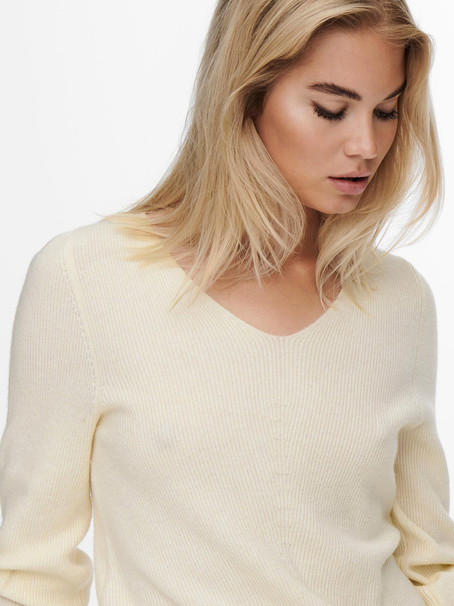 Bílý svetr s véčkovým výstřihem
