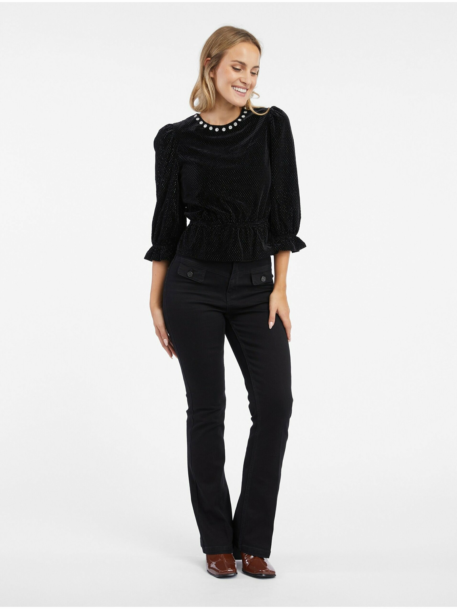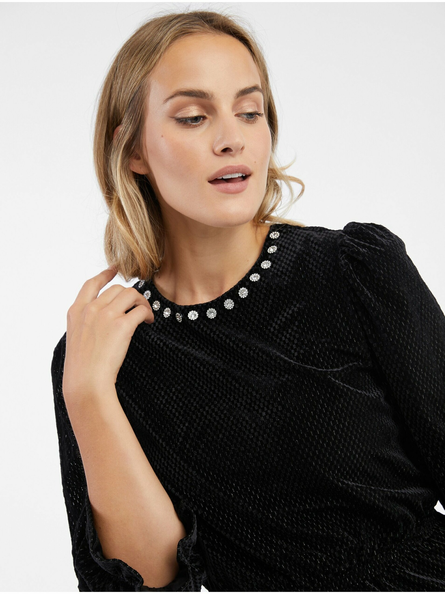 Černá halenka s ručně přišívanými korálky na výstřihu Moodo