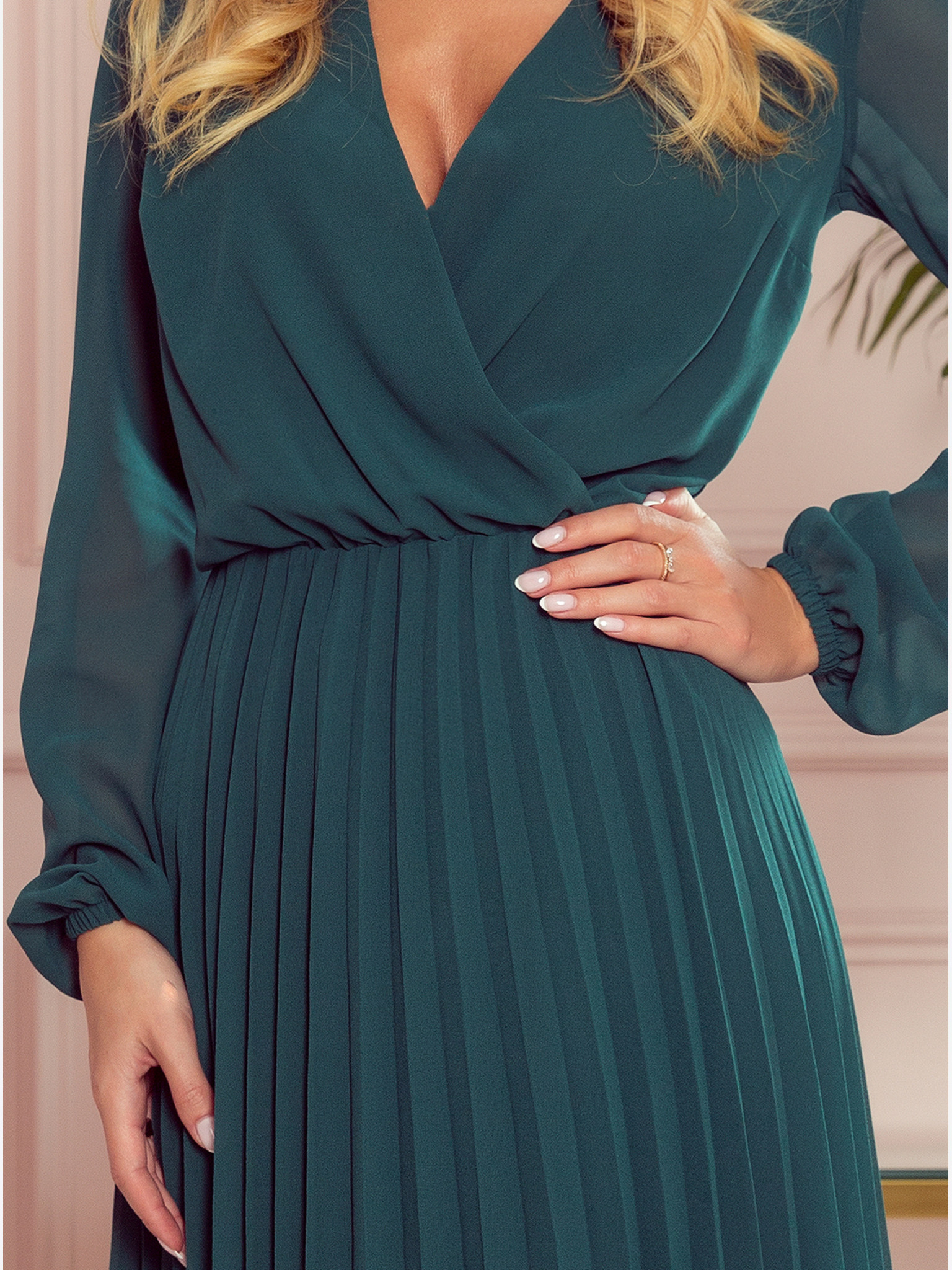 Šifonové midi šaty s dlouhým rukávem a výstřihem - zelené Numoco MILA