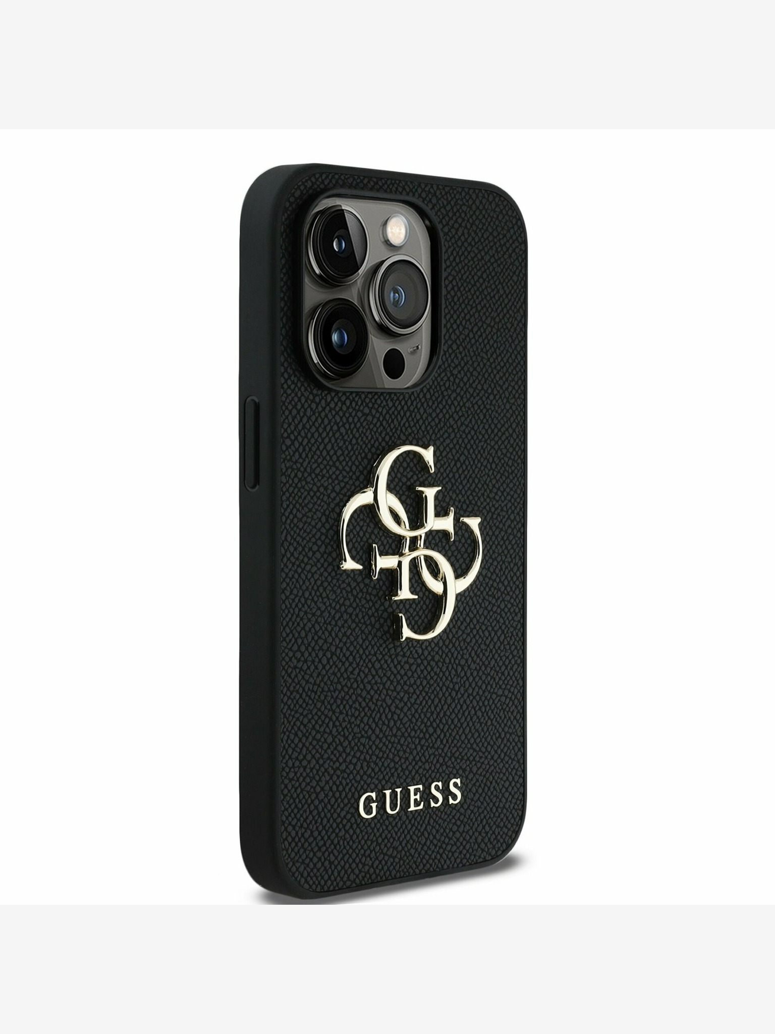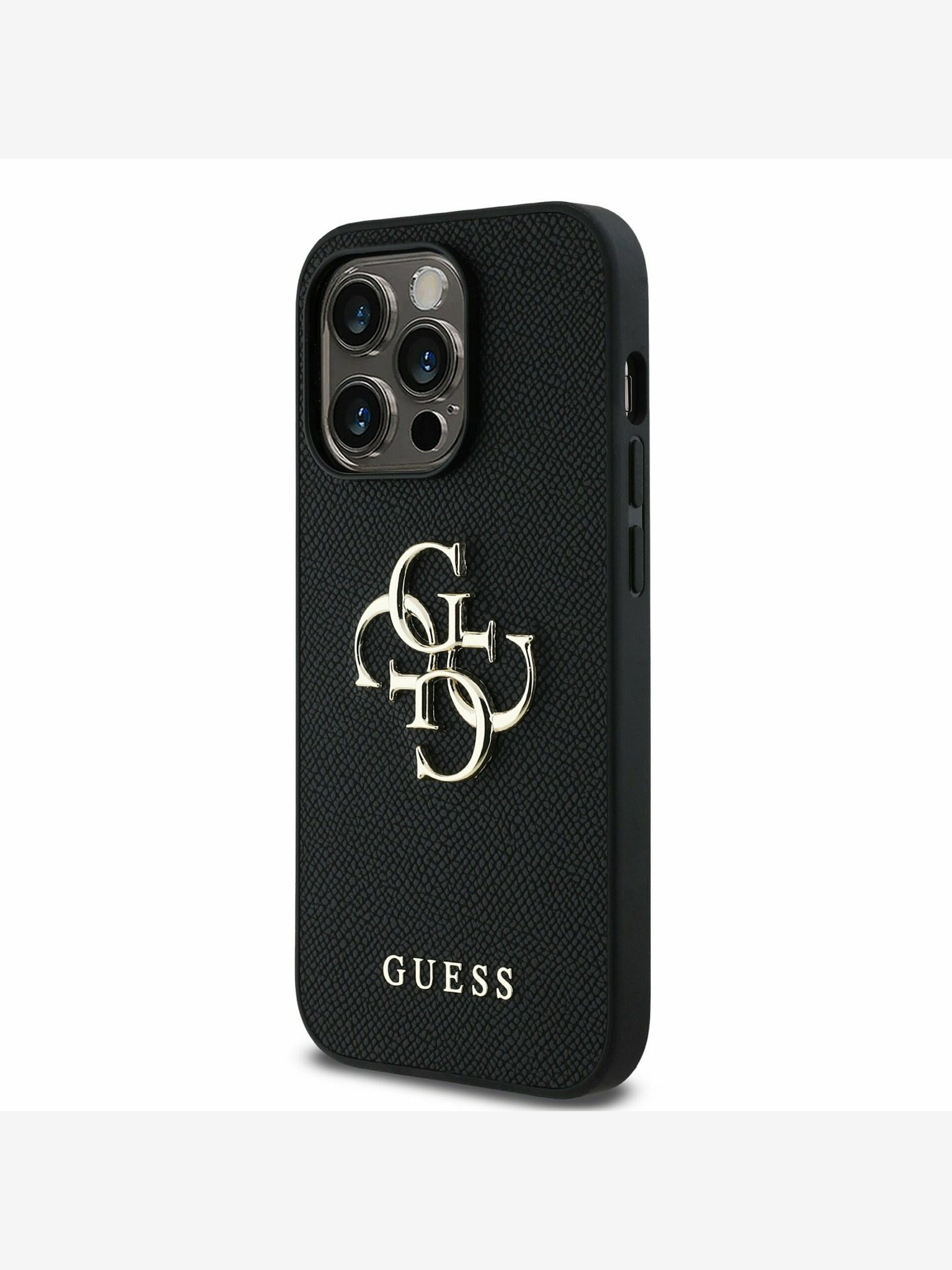 Guess PU 4G Strass Triangle Logo Stand Camera Frame MagSafe Zadní Kryt pro iPhone 15 Pro Max Black