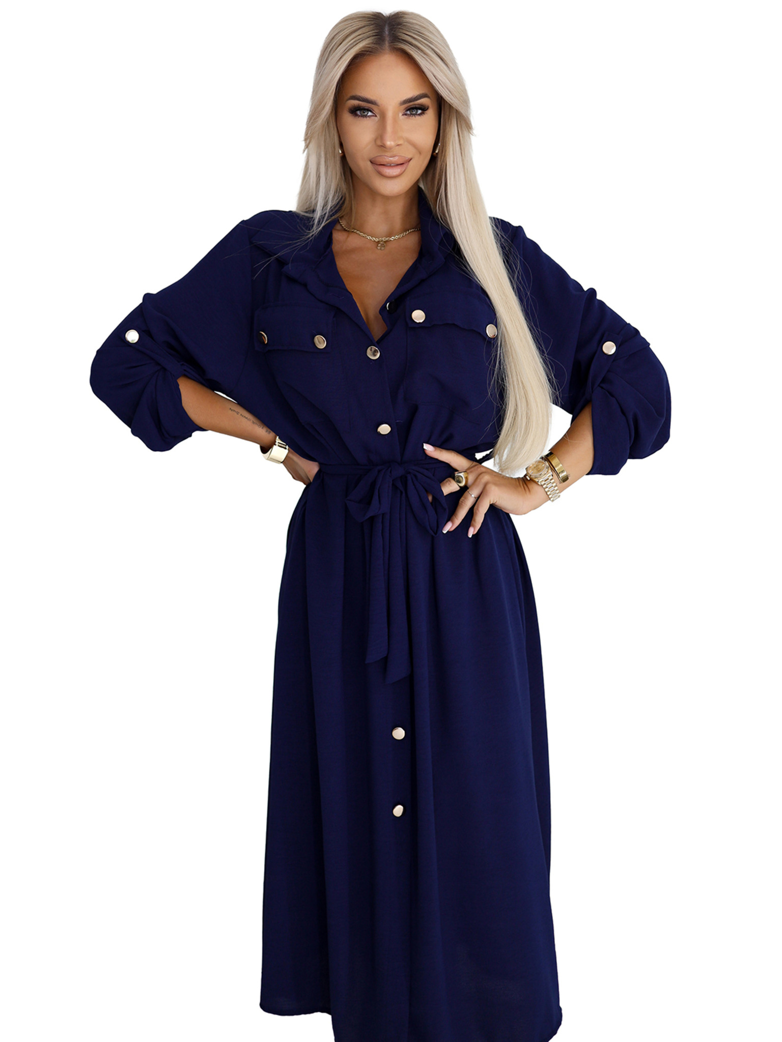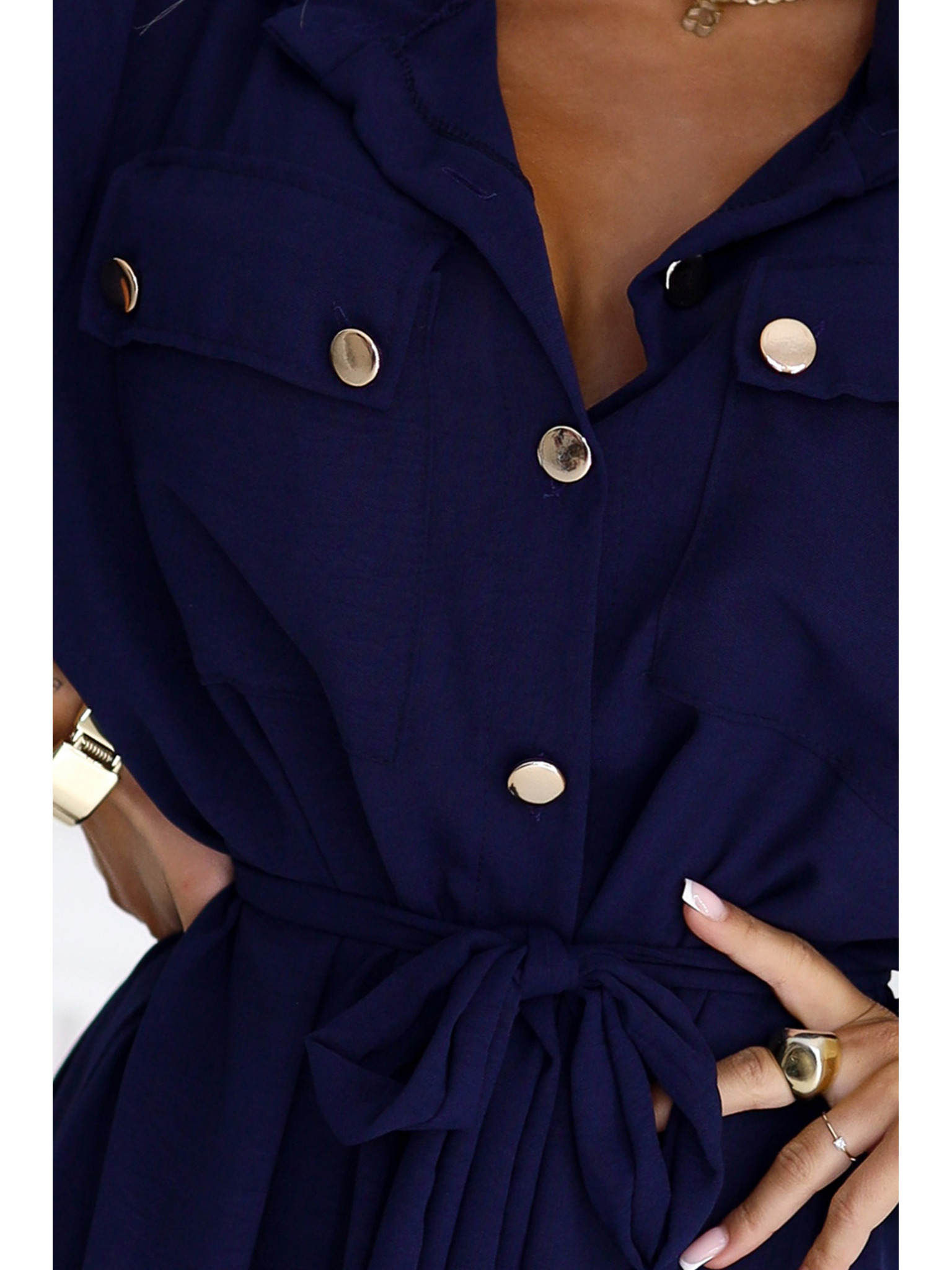 Elegantní midi košilové šaty se zlatými knoflíky a páskem
