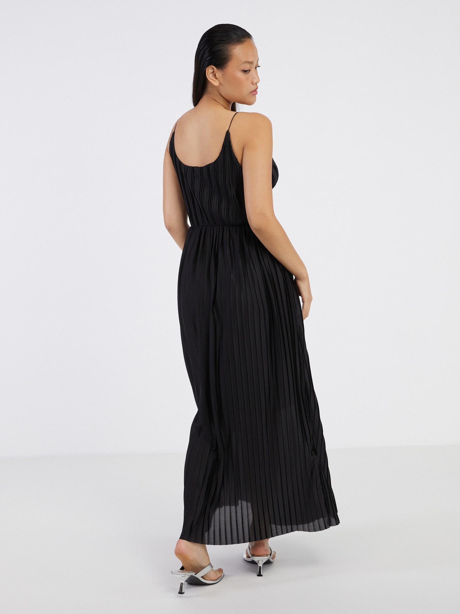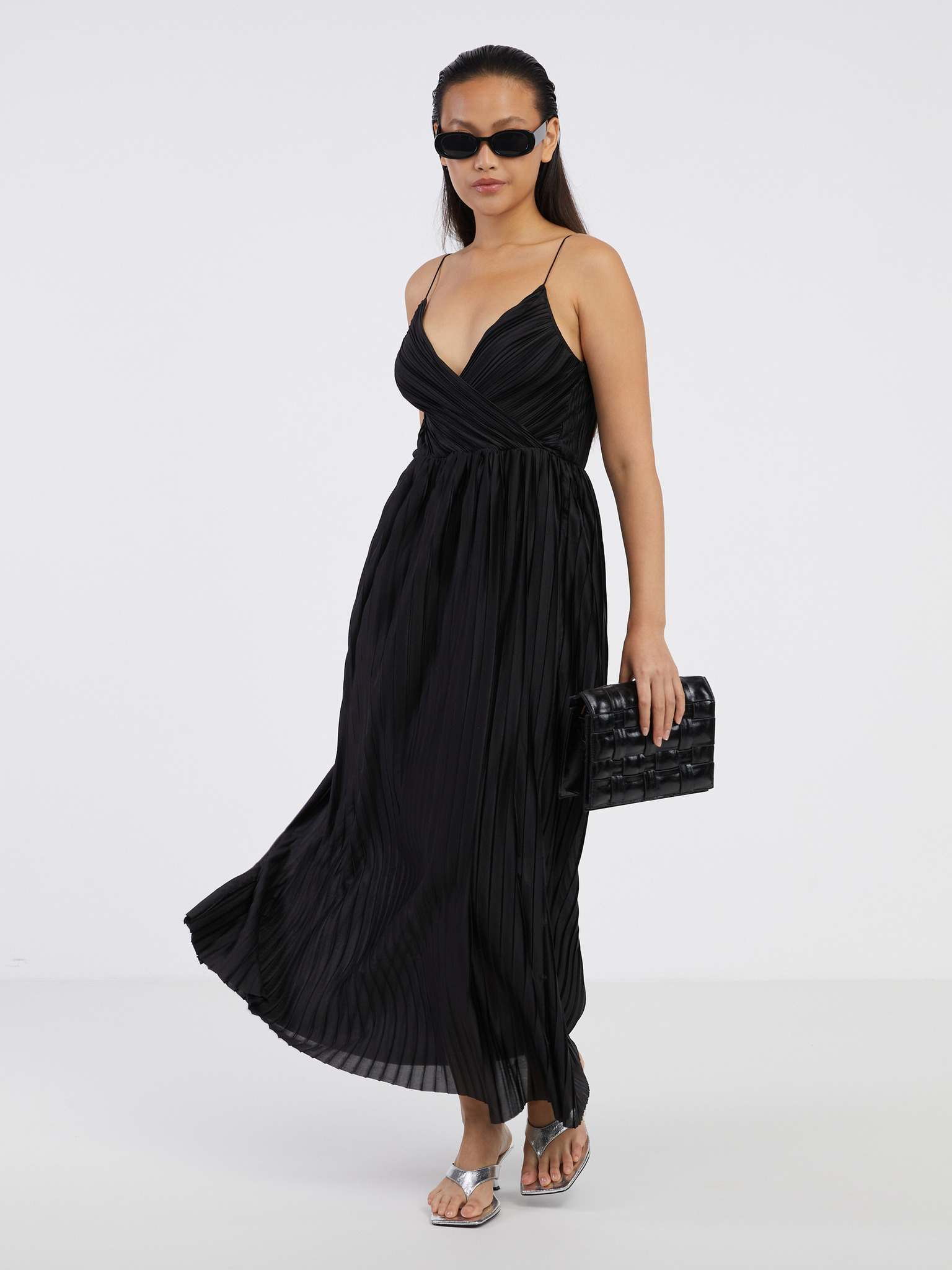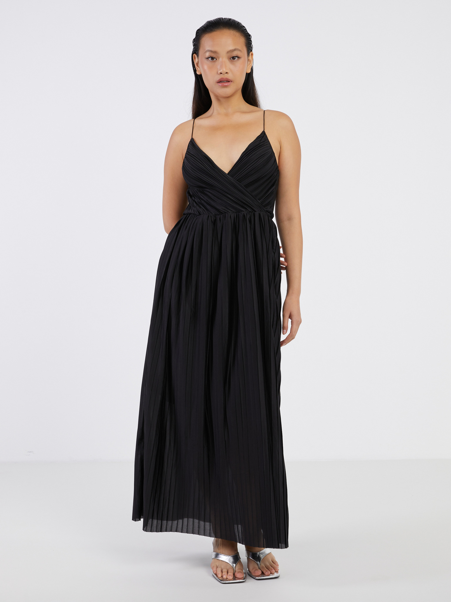 Černé dámské dlouhé saténové šaty s výstřihem a rozparkem Numoco
