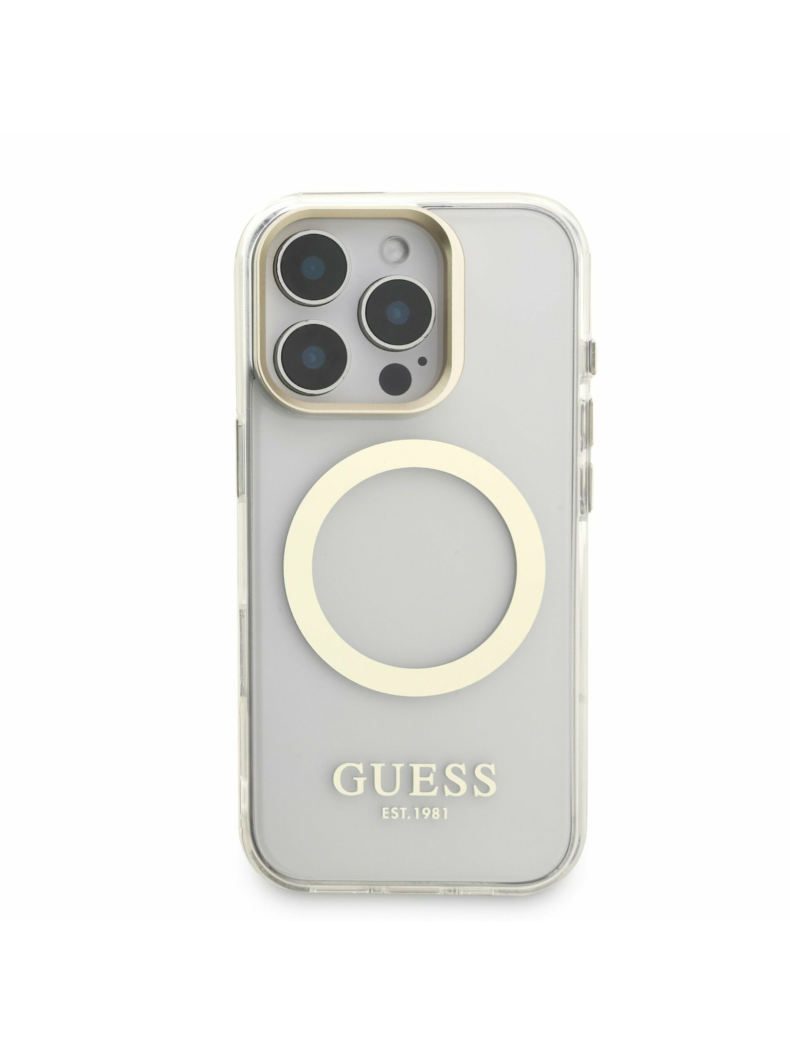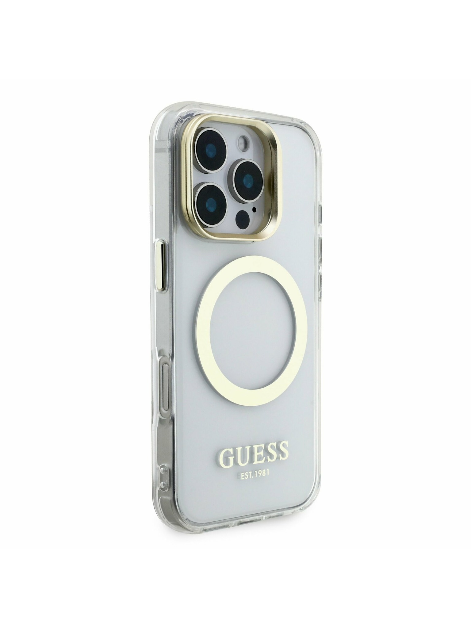 Guess IML Gold Outline Stand Camera Frame MagSafe Zadní Kryt pro iPhone 16 Pro Transparent