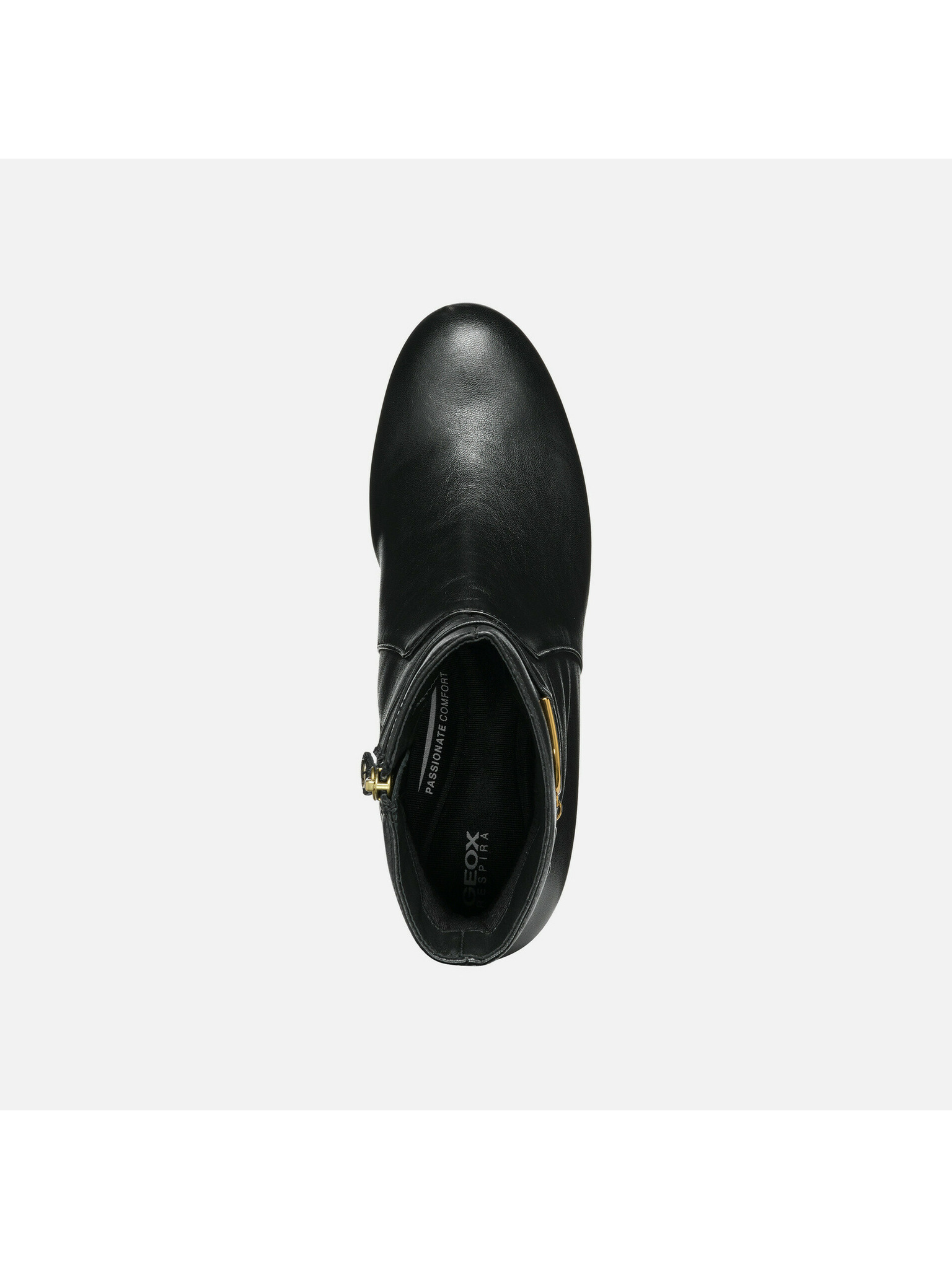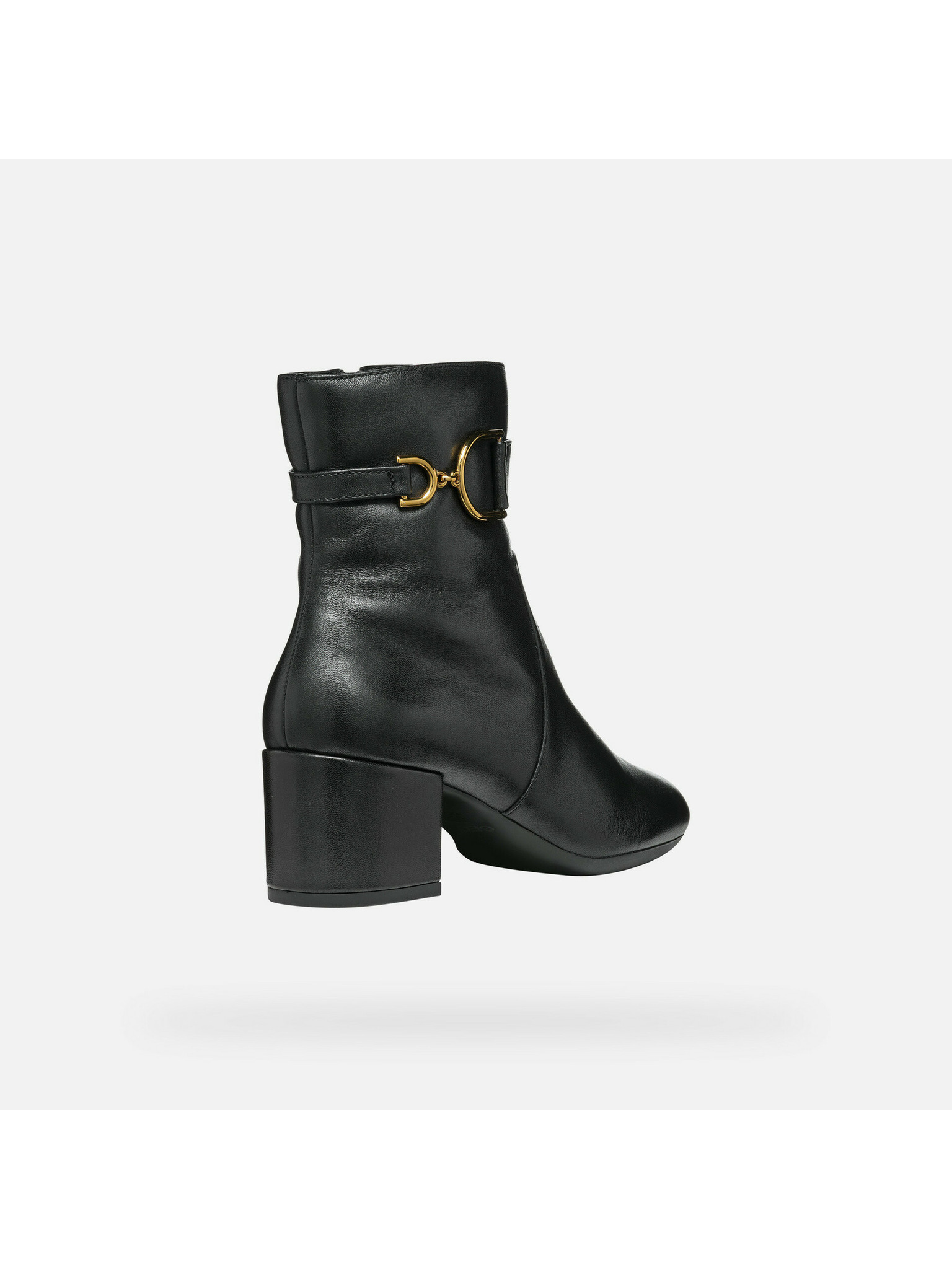 Černá dámská kotníková obuv Geox Eleana s elegantním designem a zlatým dekorativním prvkem na bočnici.
