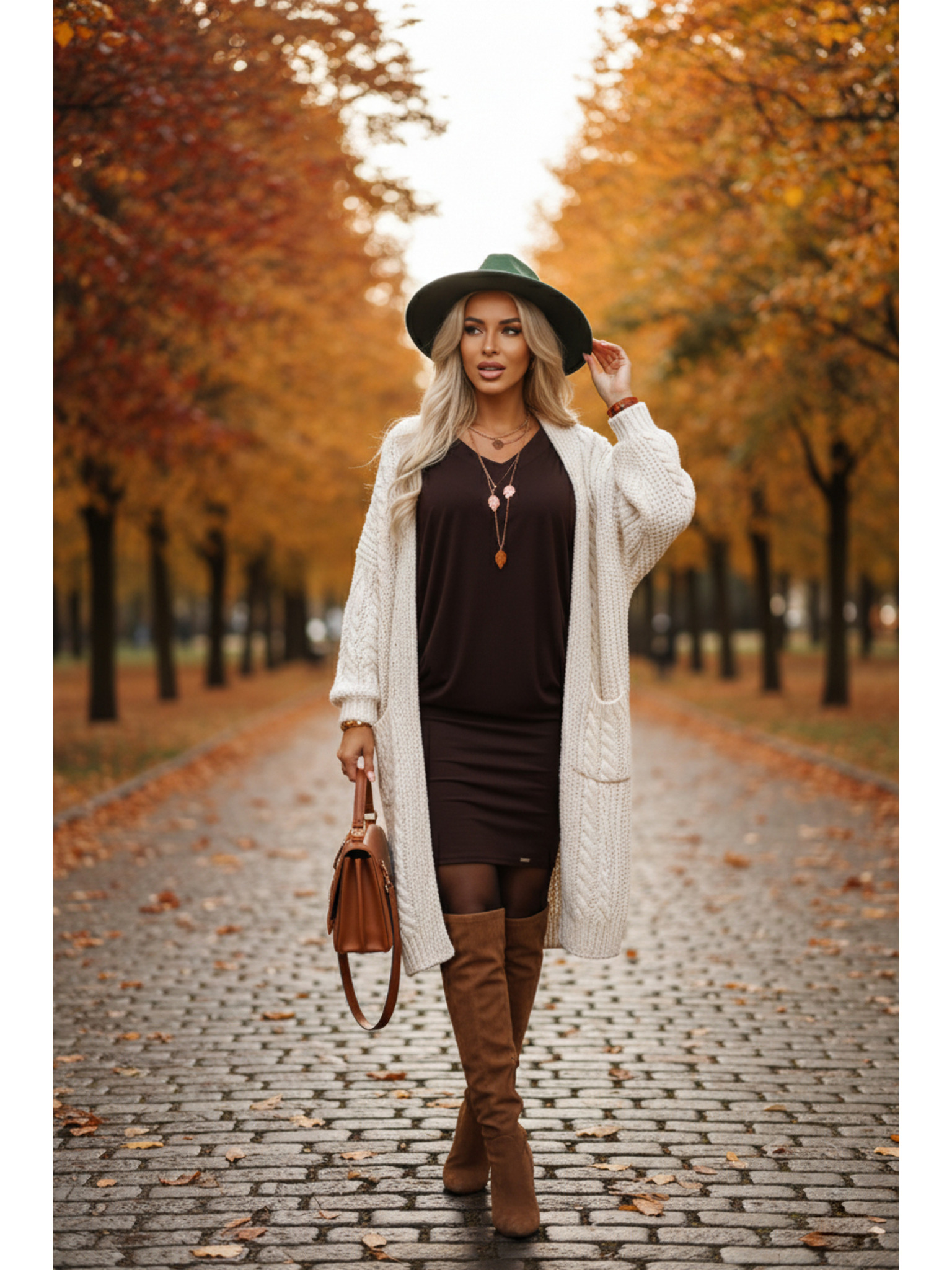 AMBER elegantní dlouhé krajkové šaty s výstřihem - čokoládové