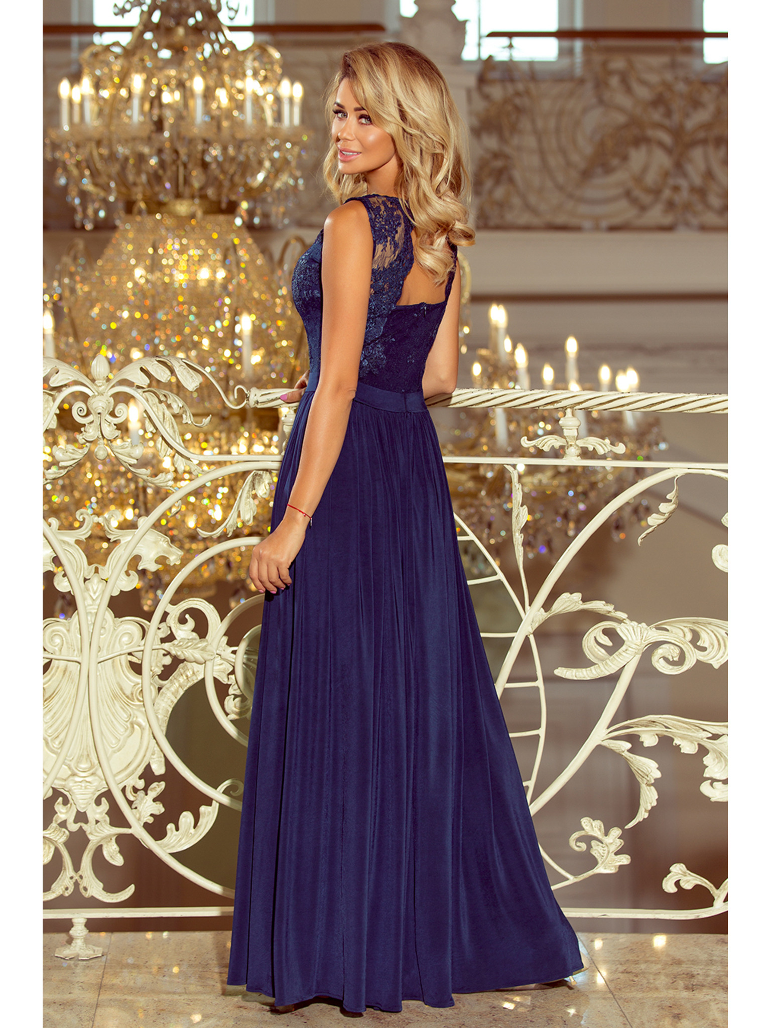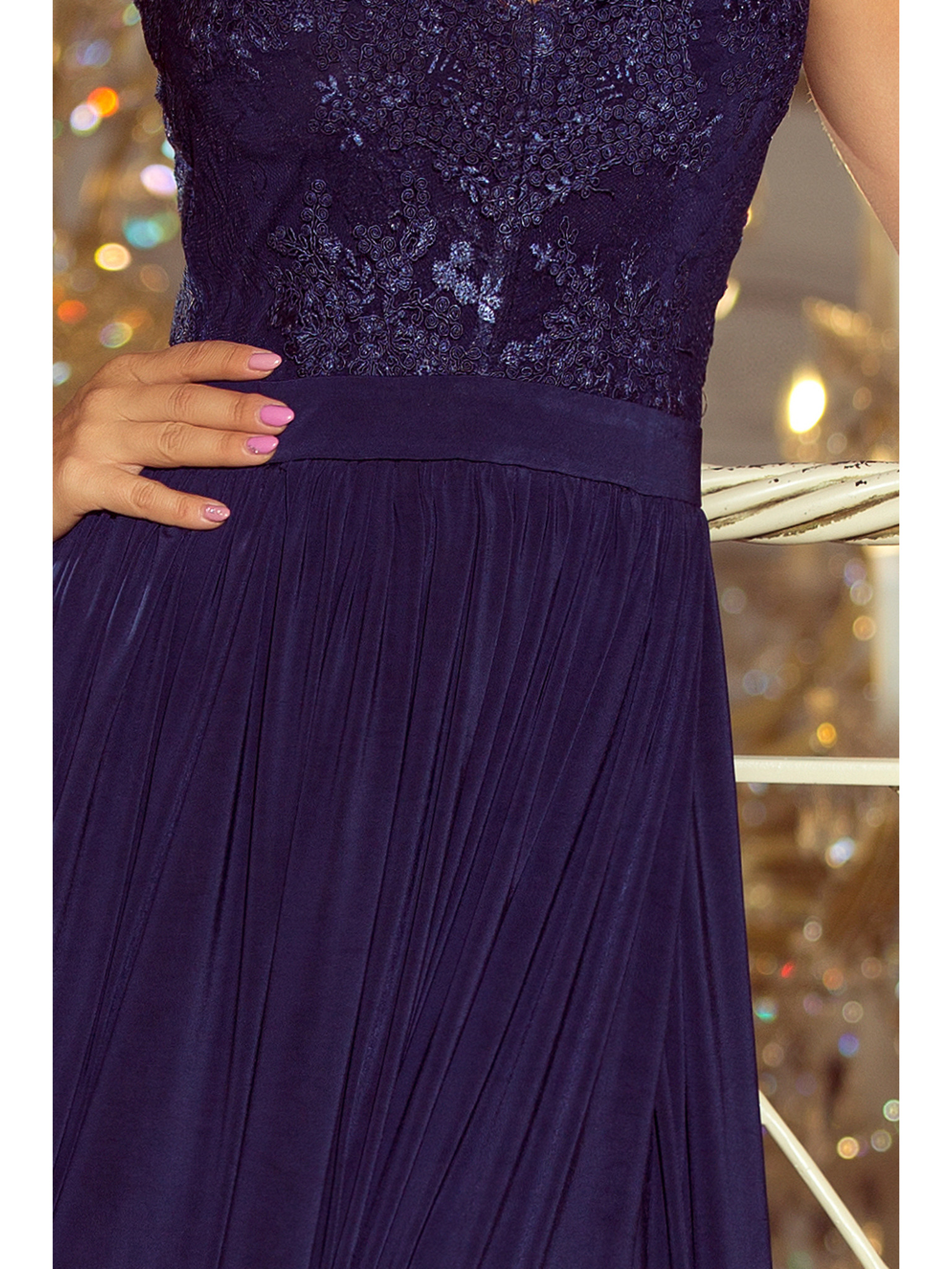 LEA Dlouhé elegantní maxi šaty s krajkovým vrškem a rozparkem na nohavici - tmavě modré