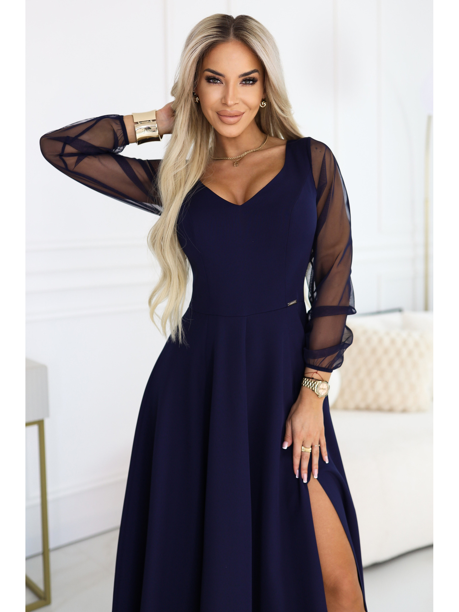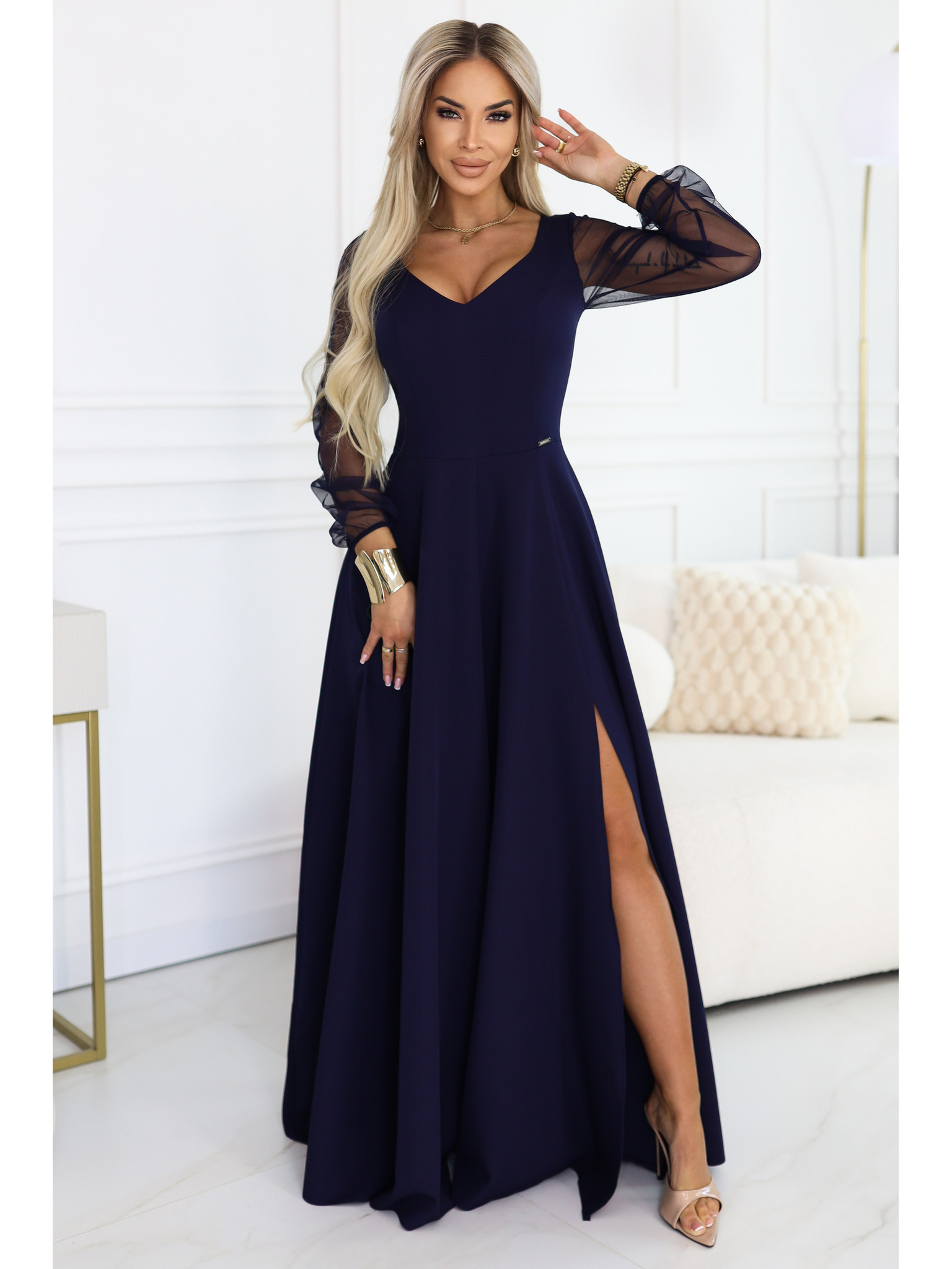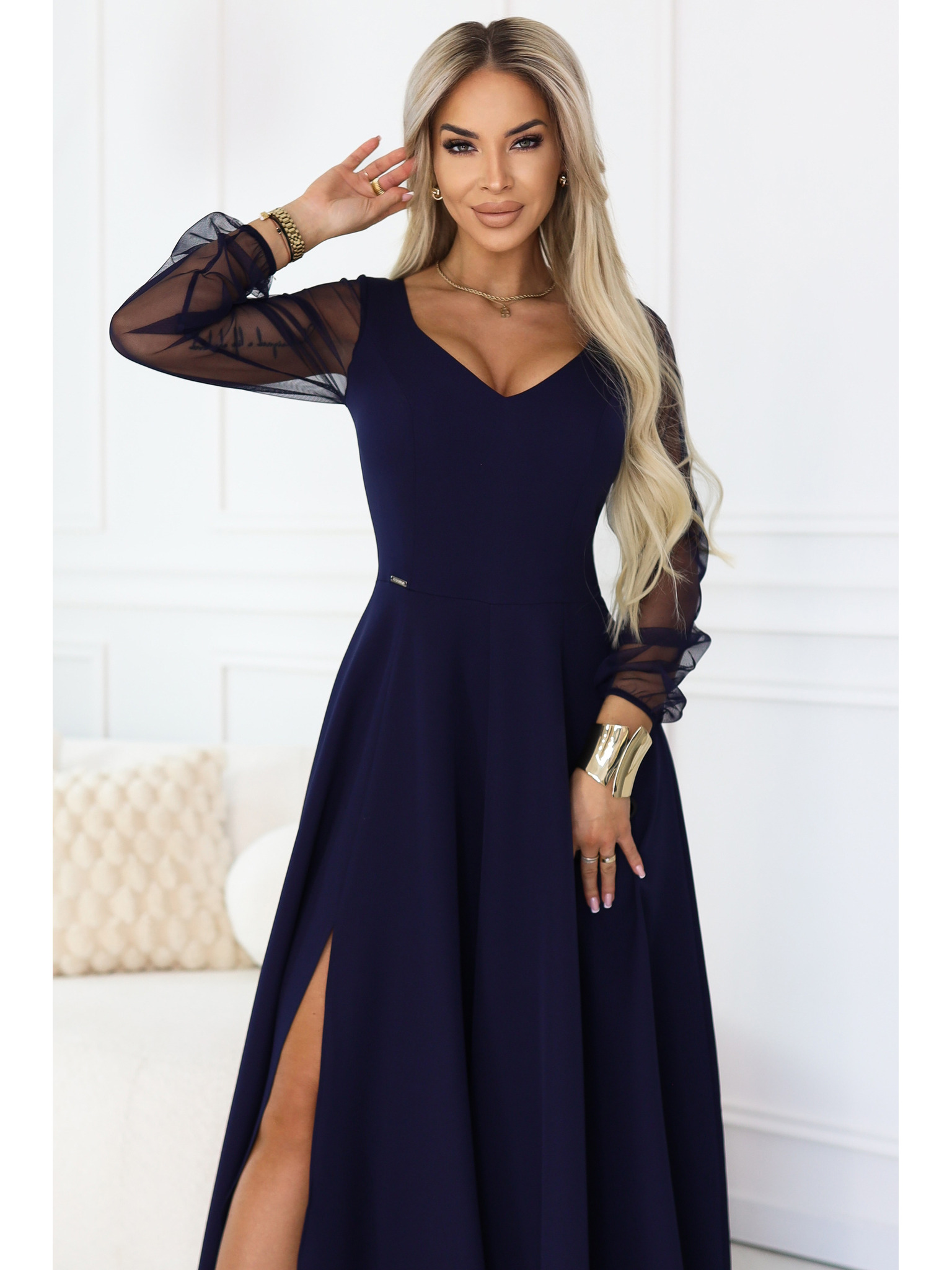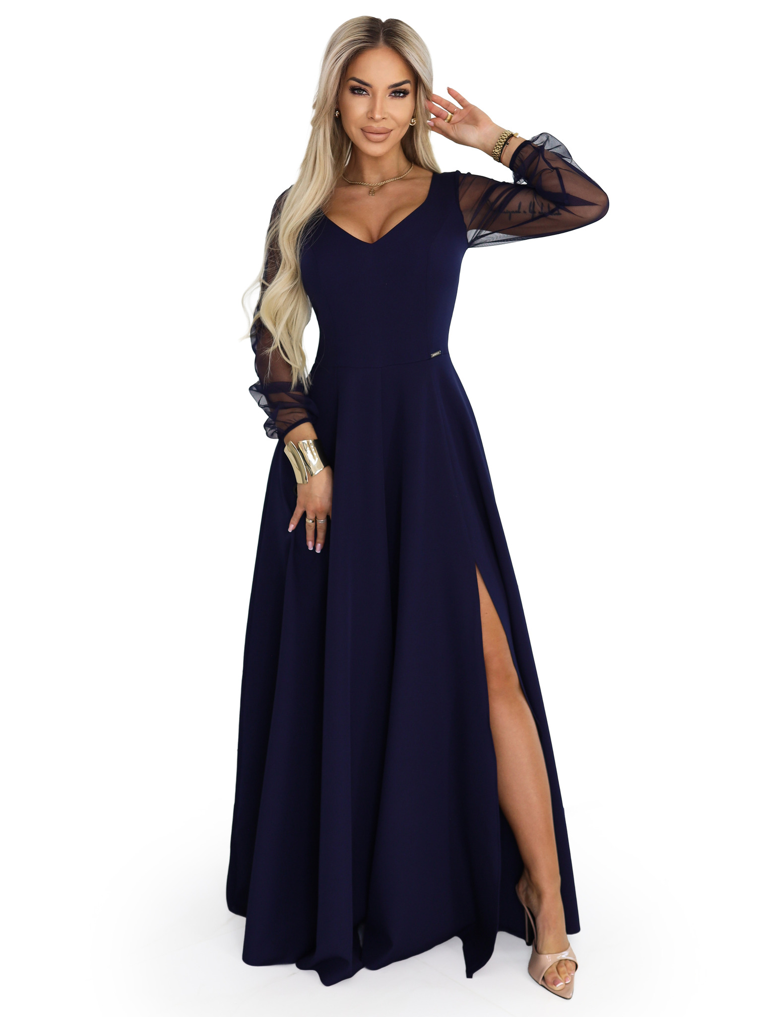 Elegantní maxi šaty s volánky, hlubokým výstřihem a rozparkem na nohavici - tmavě modré
