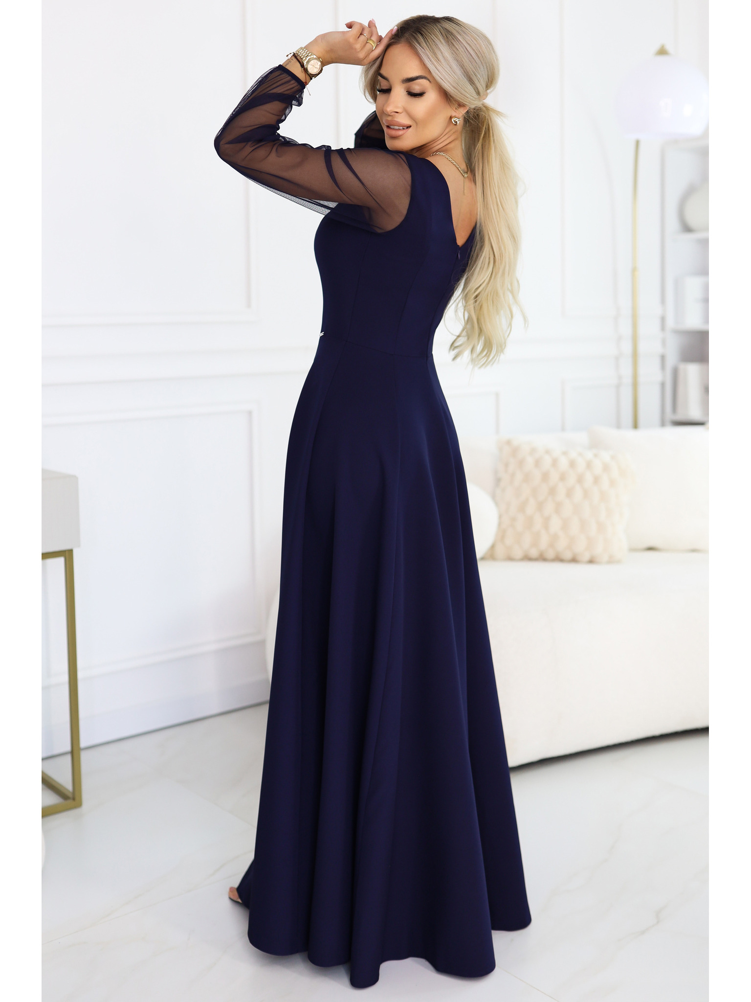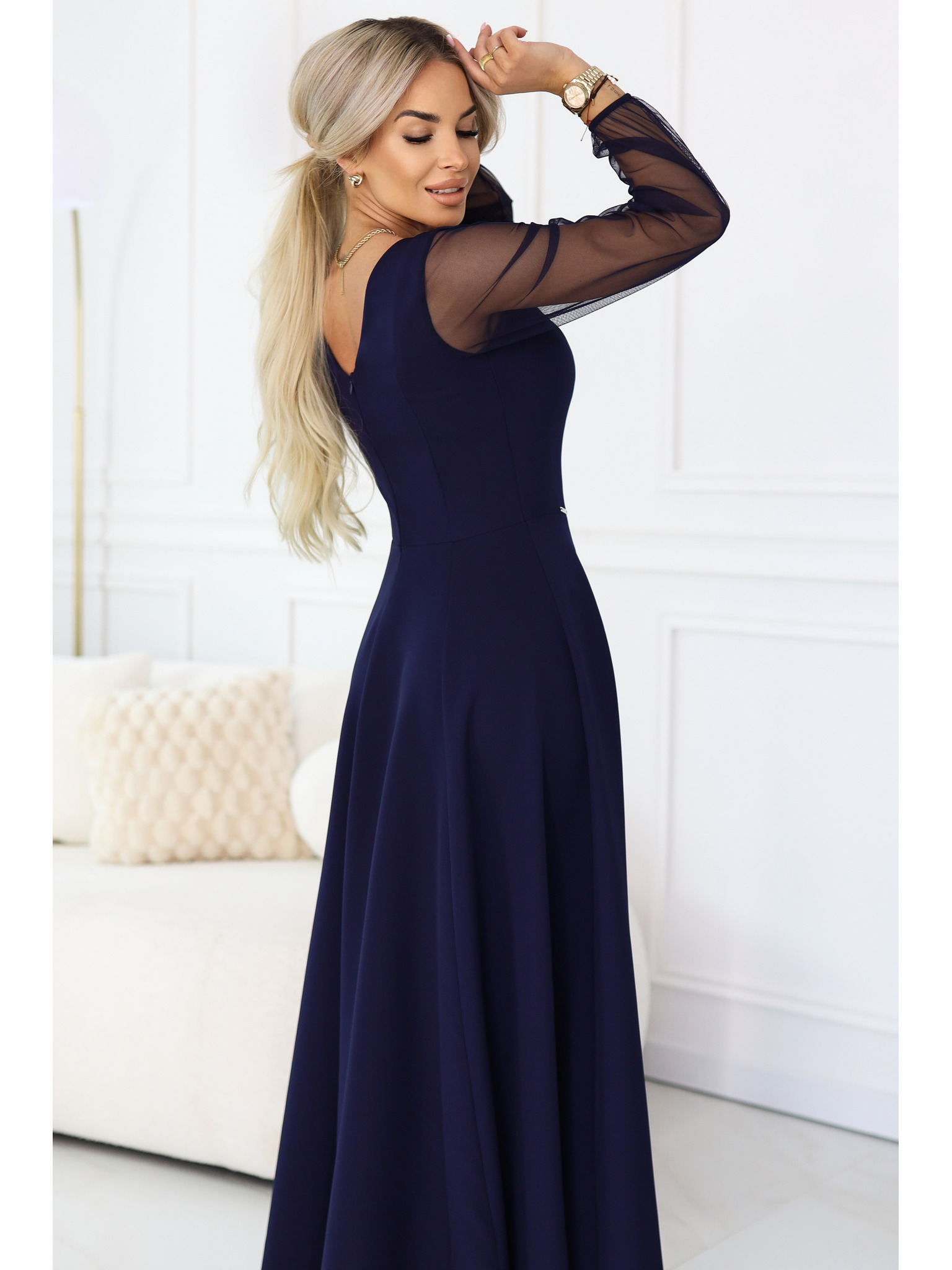 LORETTA unikátní dlouhé šaty s tylovými rukávy a výstřihem - černé