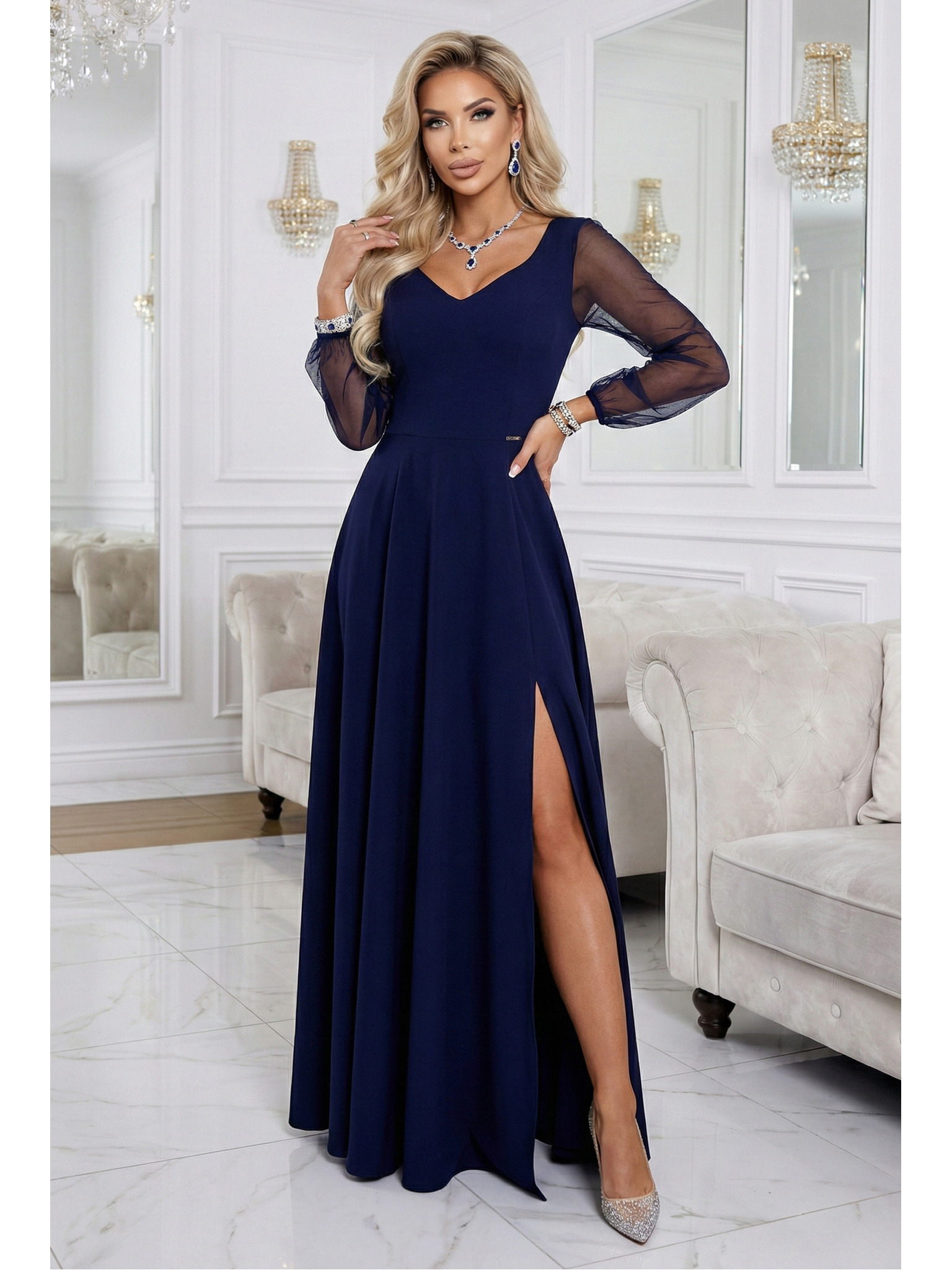 LEA Dlouhé elegantní maxi šaty s krajkovým vrškem a rozparkem na nohavici - tmavě modré