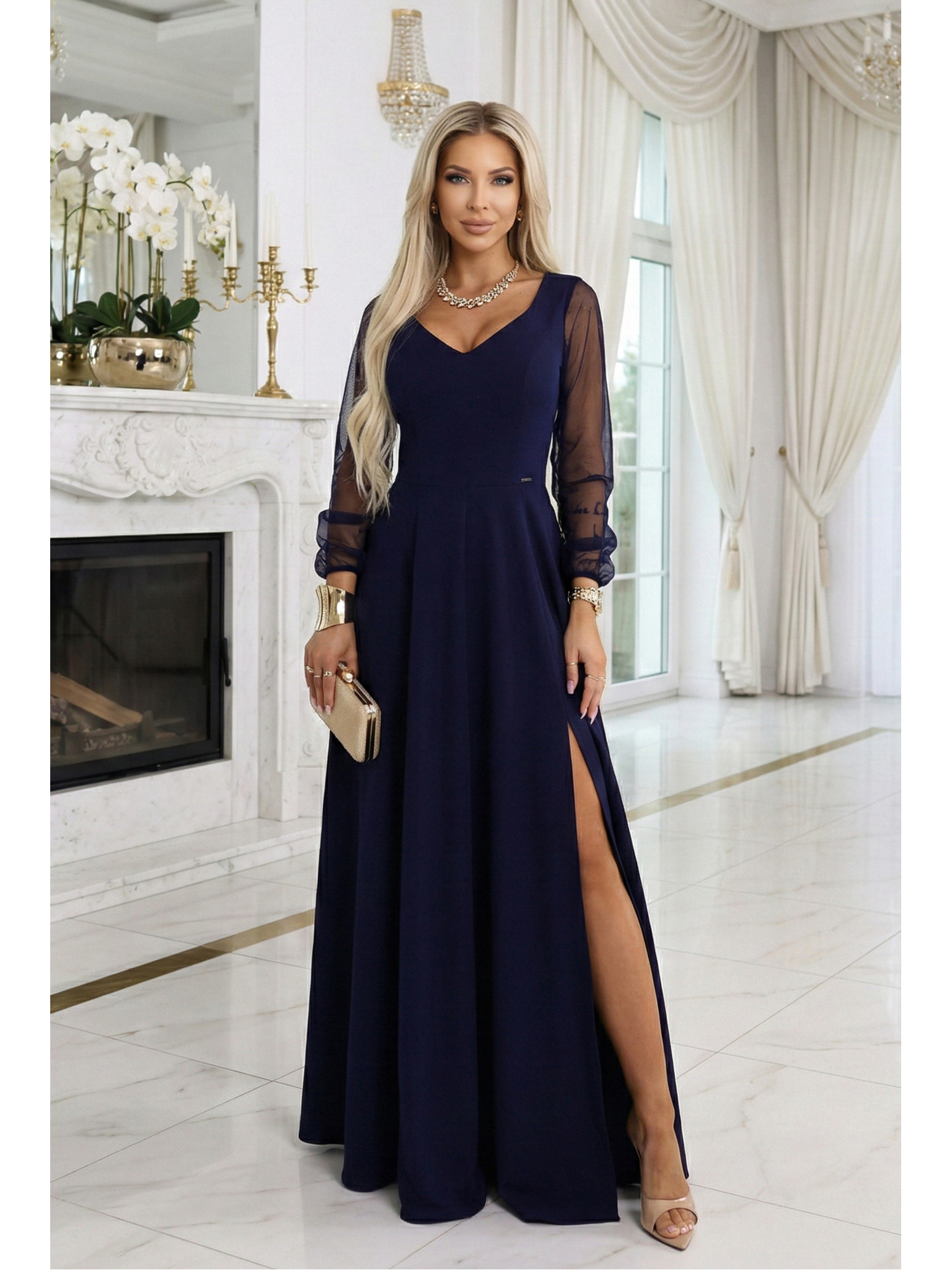Elegantní večerní maxi šaty s rozparkem a růžemi - námořnická modrá