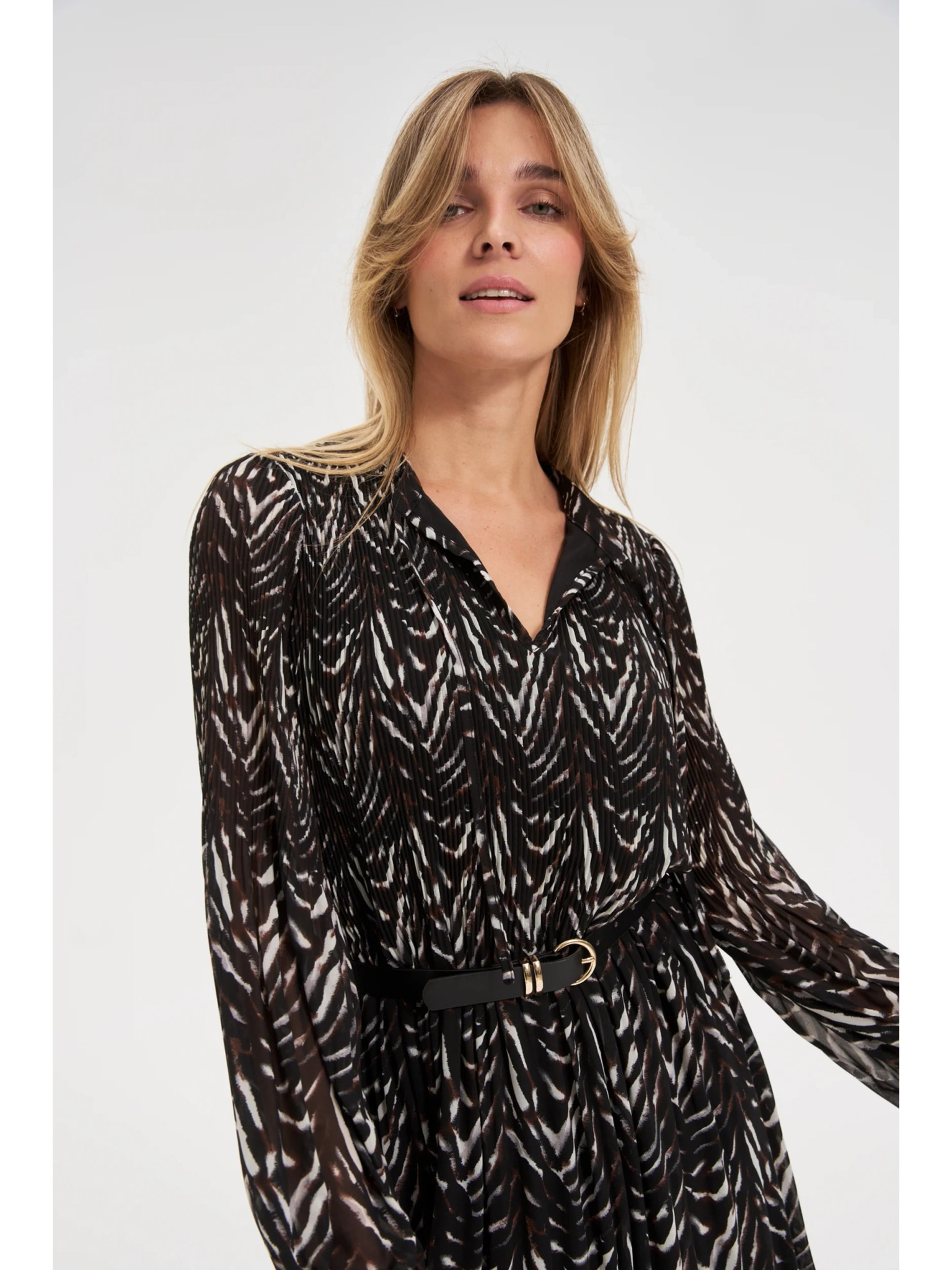 IVANA pohodlné trapézové šaty s výstřihem a dlouhým rukávem - čokoládové