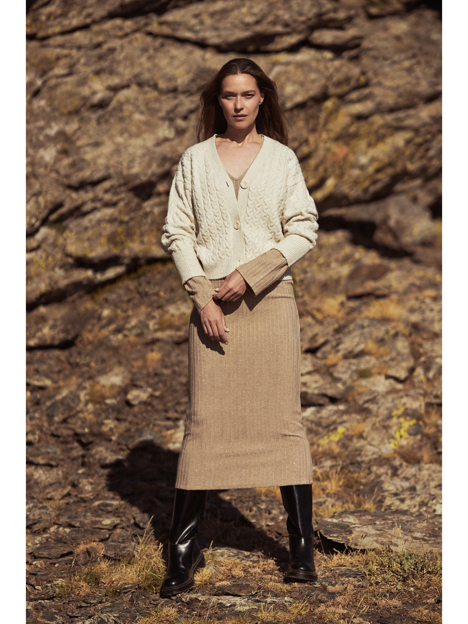 JENNIFER dlouhé šaty s rozparkem na nohavici, rukávy a výstřihem - béžové