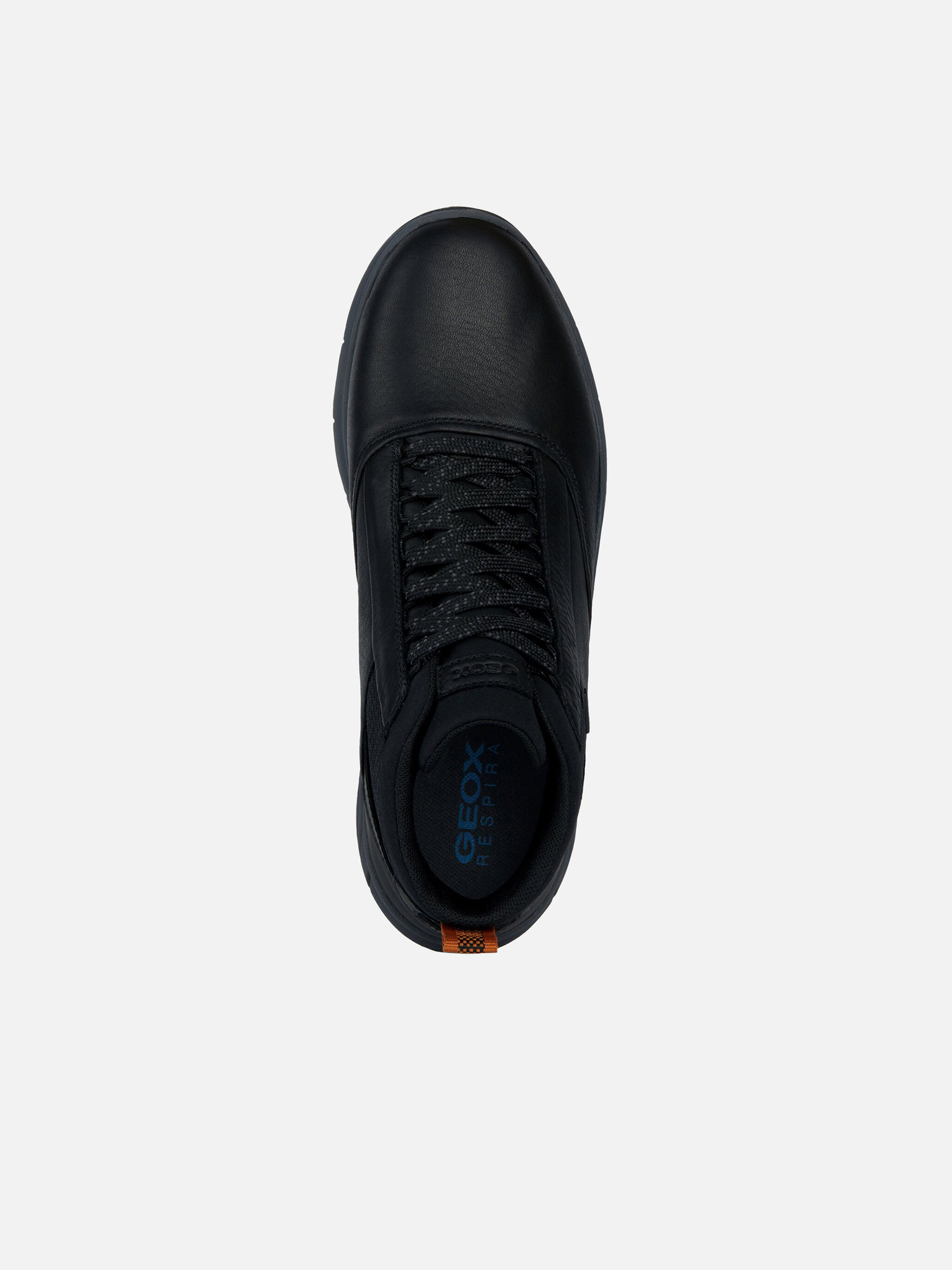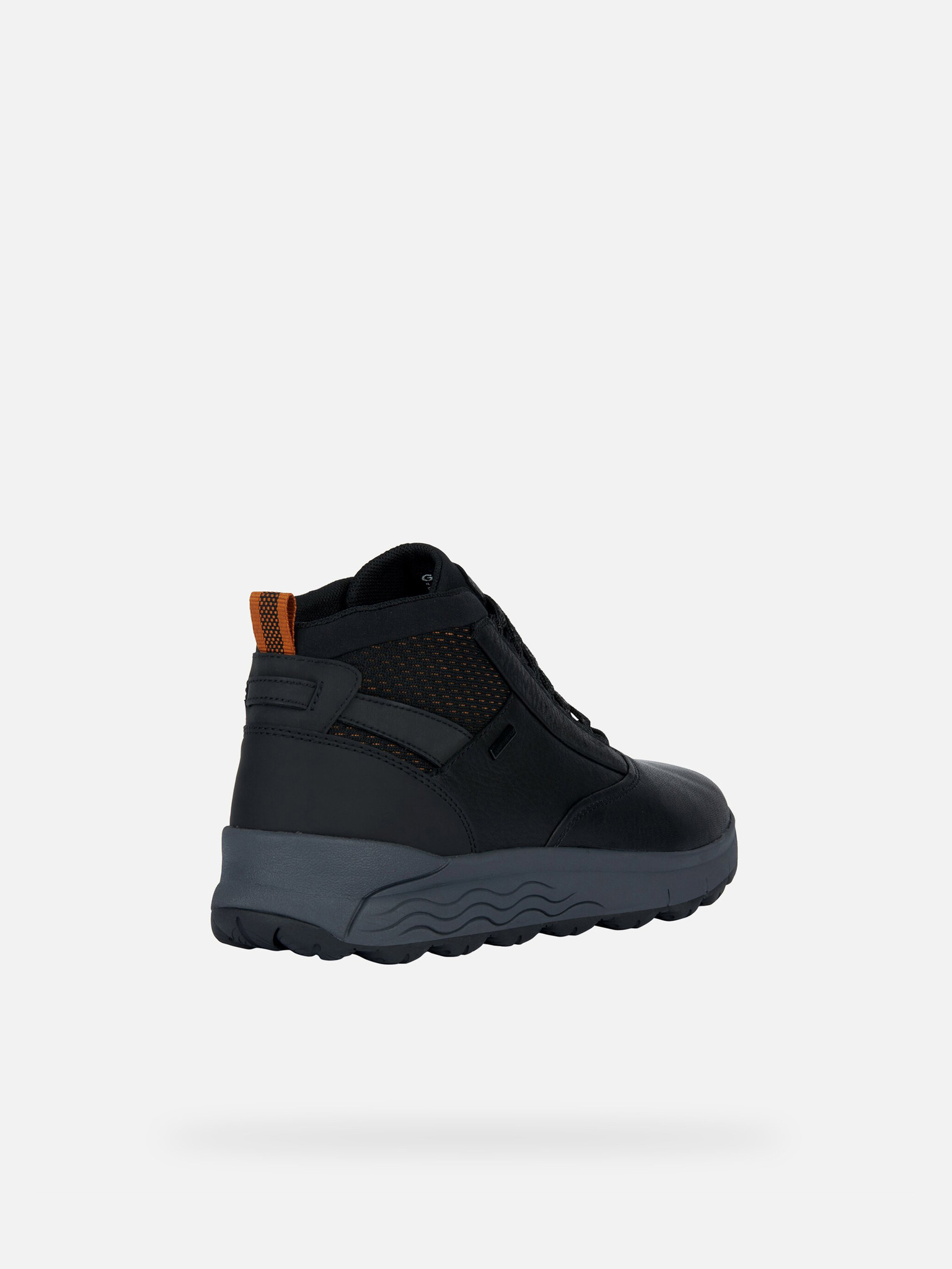 Černé pánské tenisky Geox Spherica 4X4 B ABX kombinují moderní design s praktickými prvky. Dominantní černé provedení doplňují oranžové detaily v pleteném vzoru u kotníku. Bota je vybavena praktickým poutkem na patě pro snadné obouvání a klasickým šněrováním.