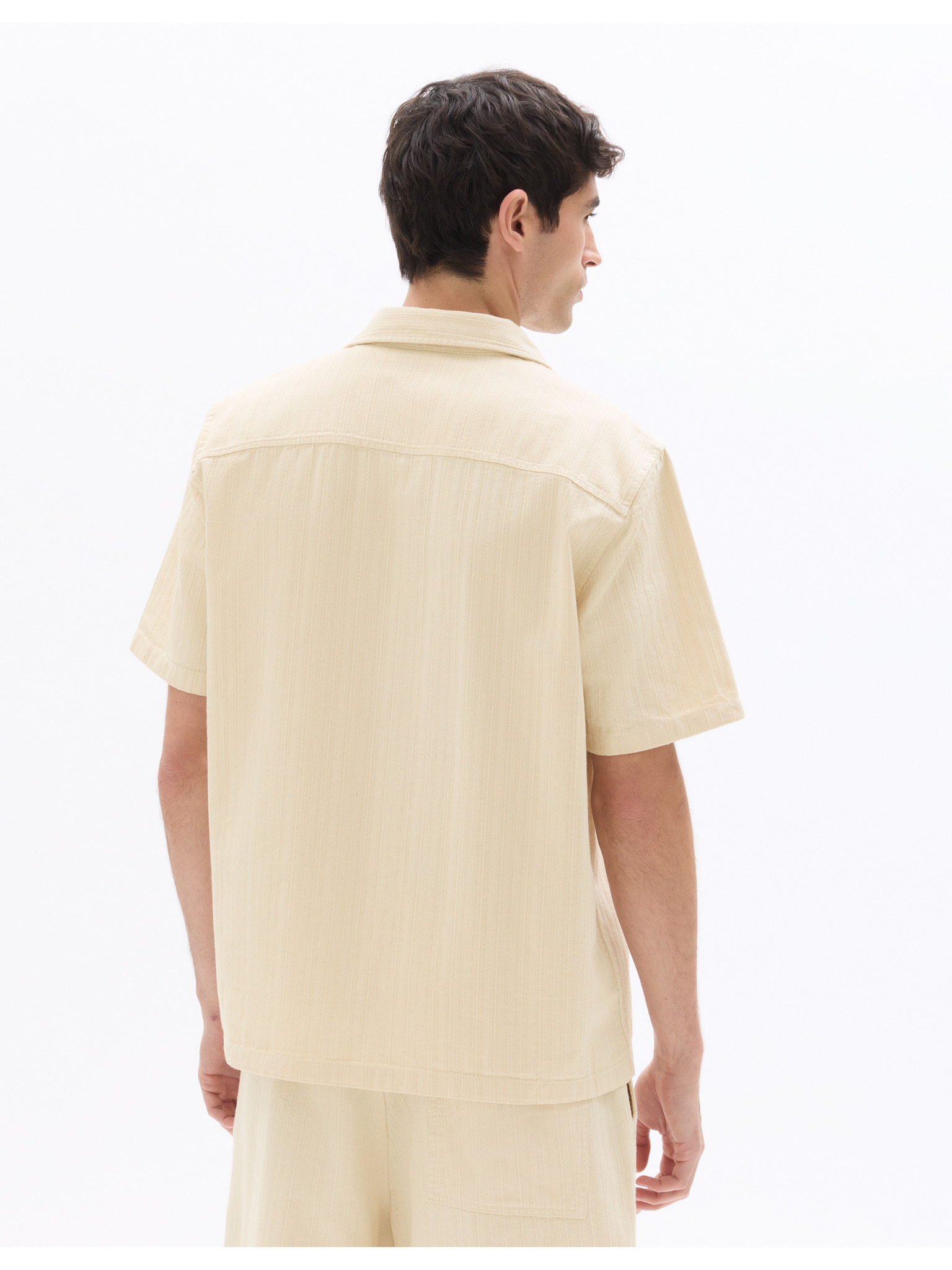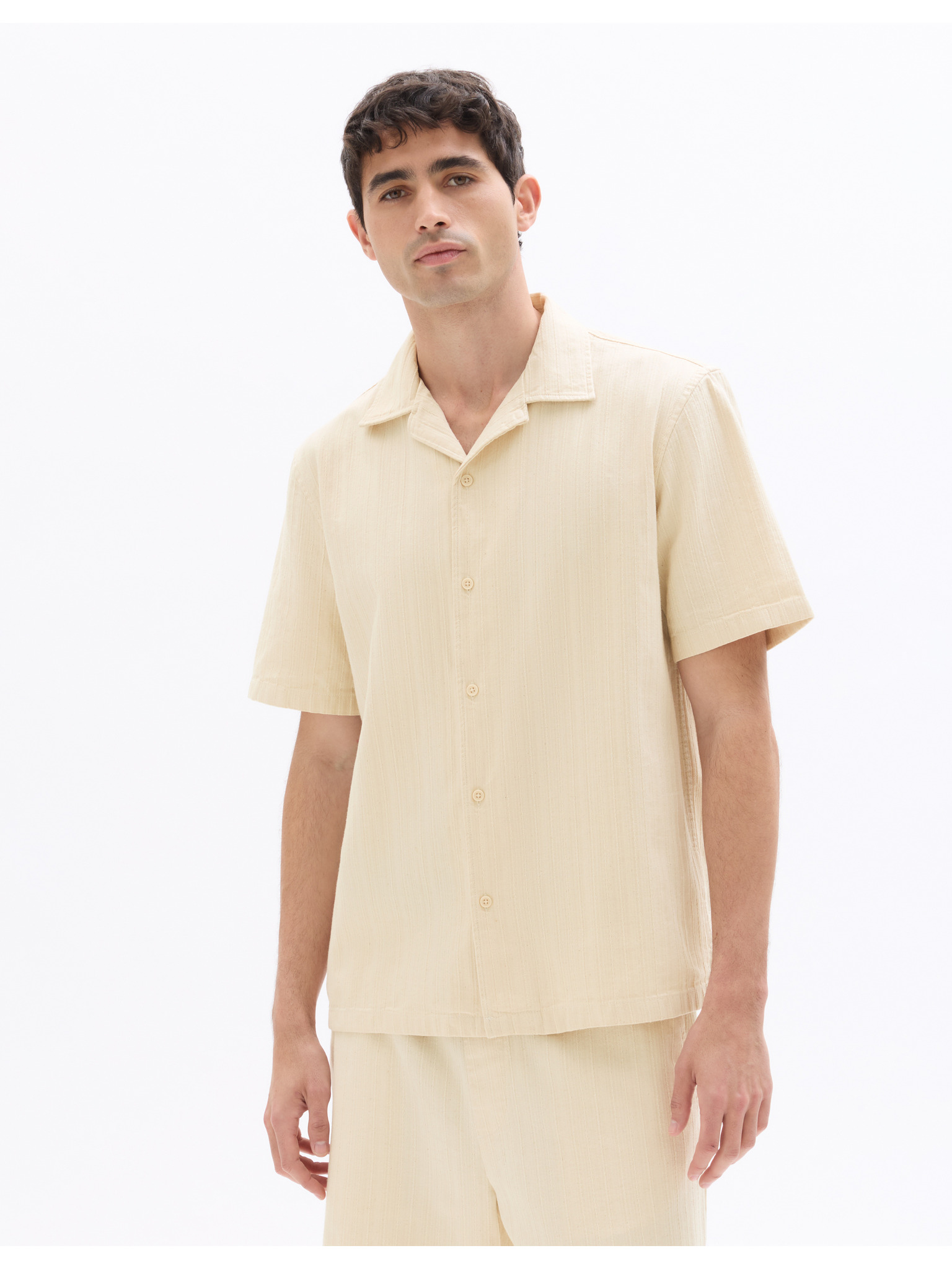 Pánská košile s krátkým rukávem a kubánským límcem béžová Ombre Clothing