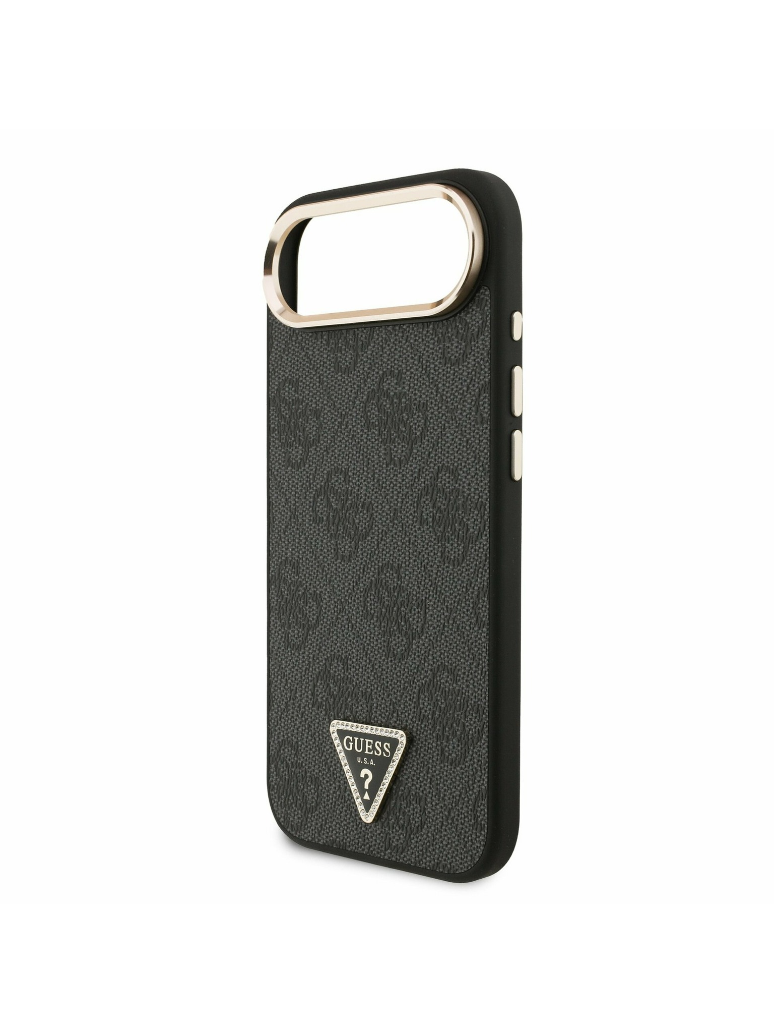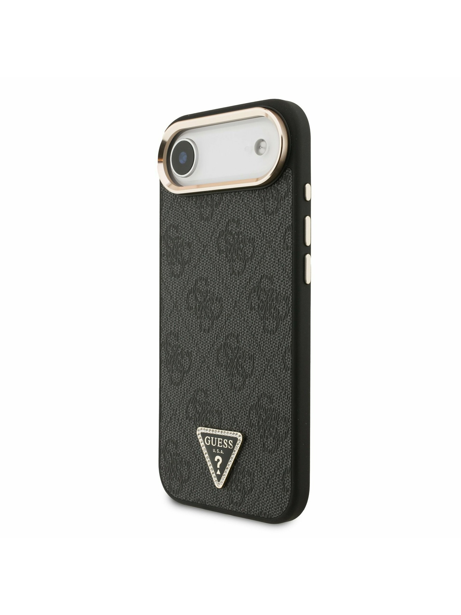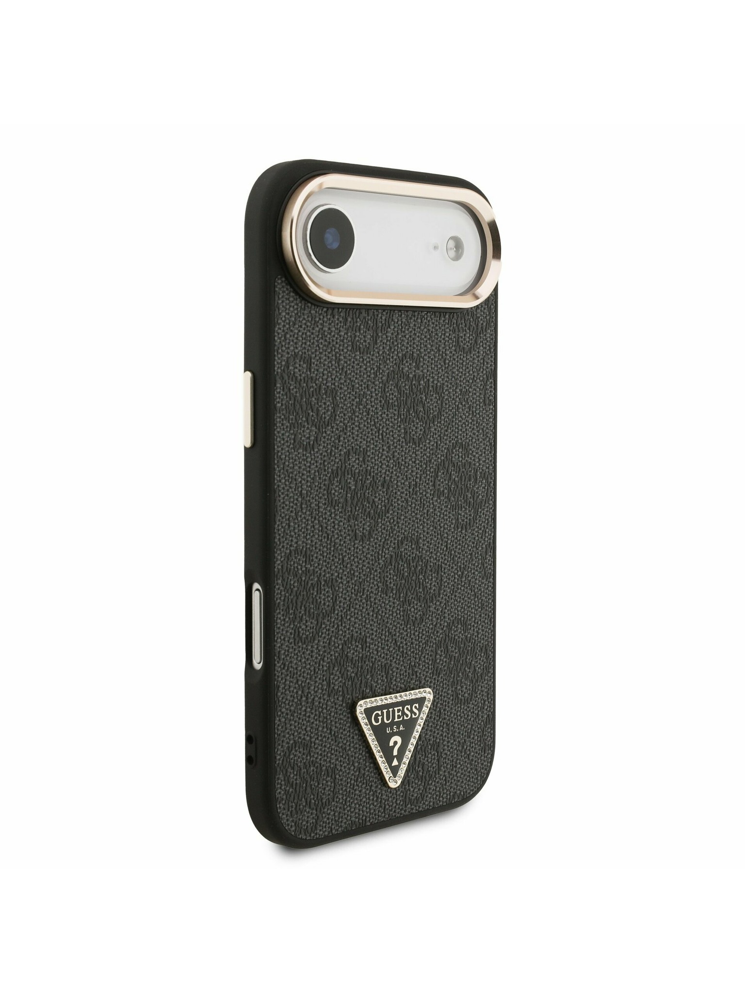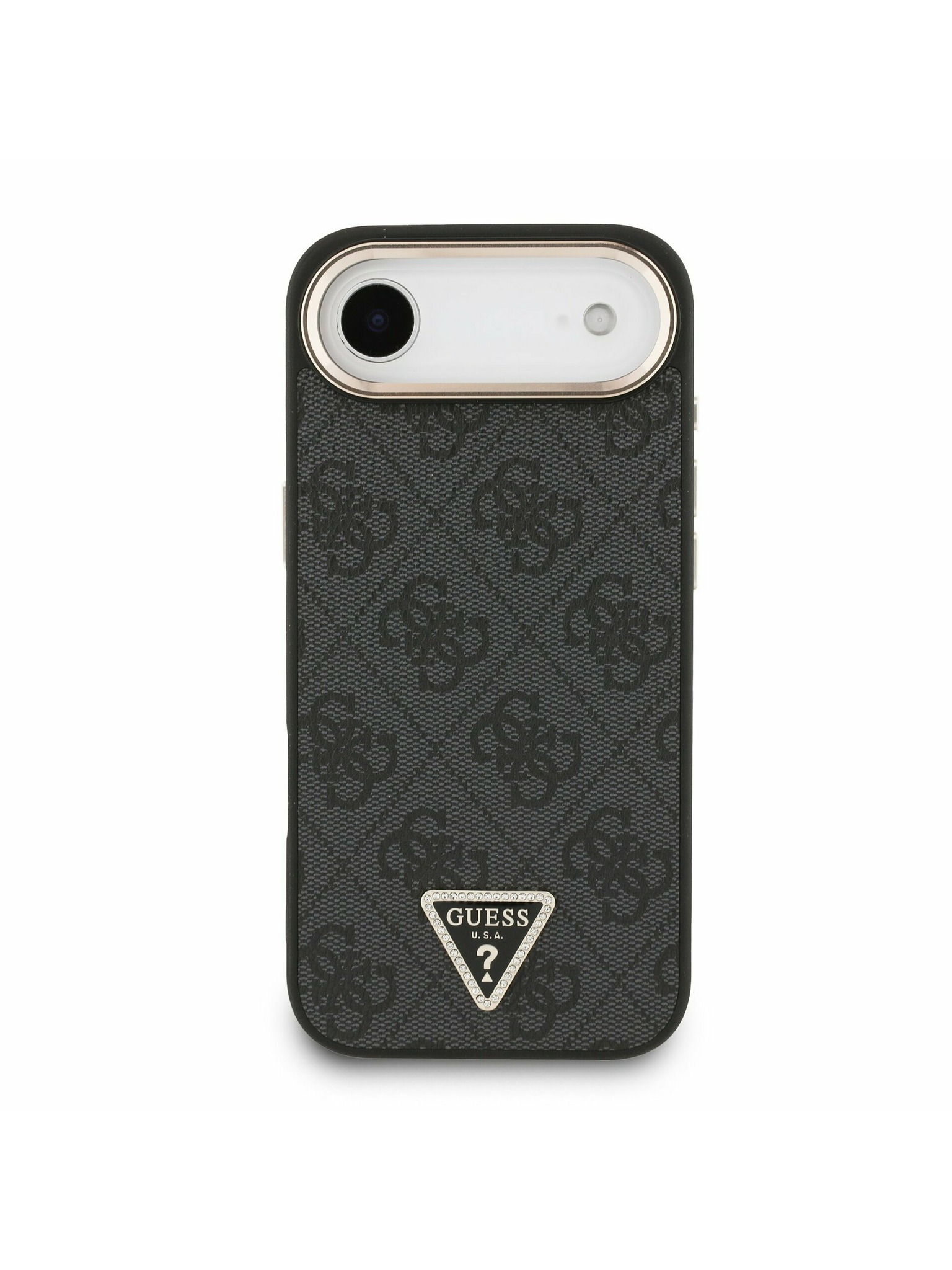 Guess PU 4G Strass Triangle Logo Stand Camera Frame MagSafe Zadní Kryt pro iPhone 16 Pro Brown