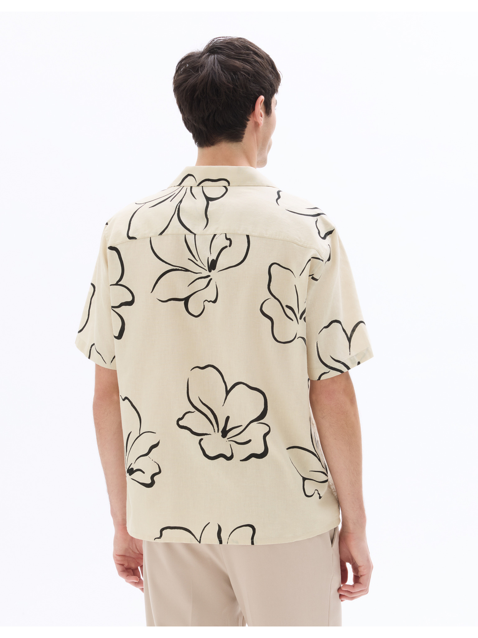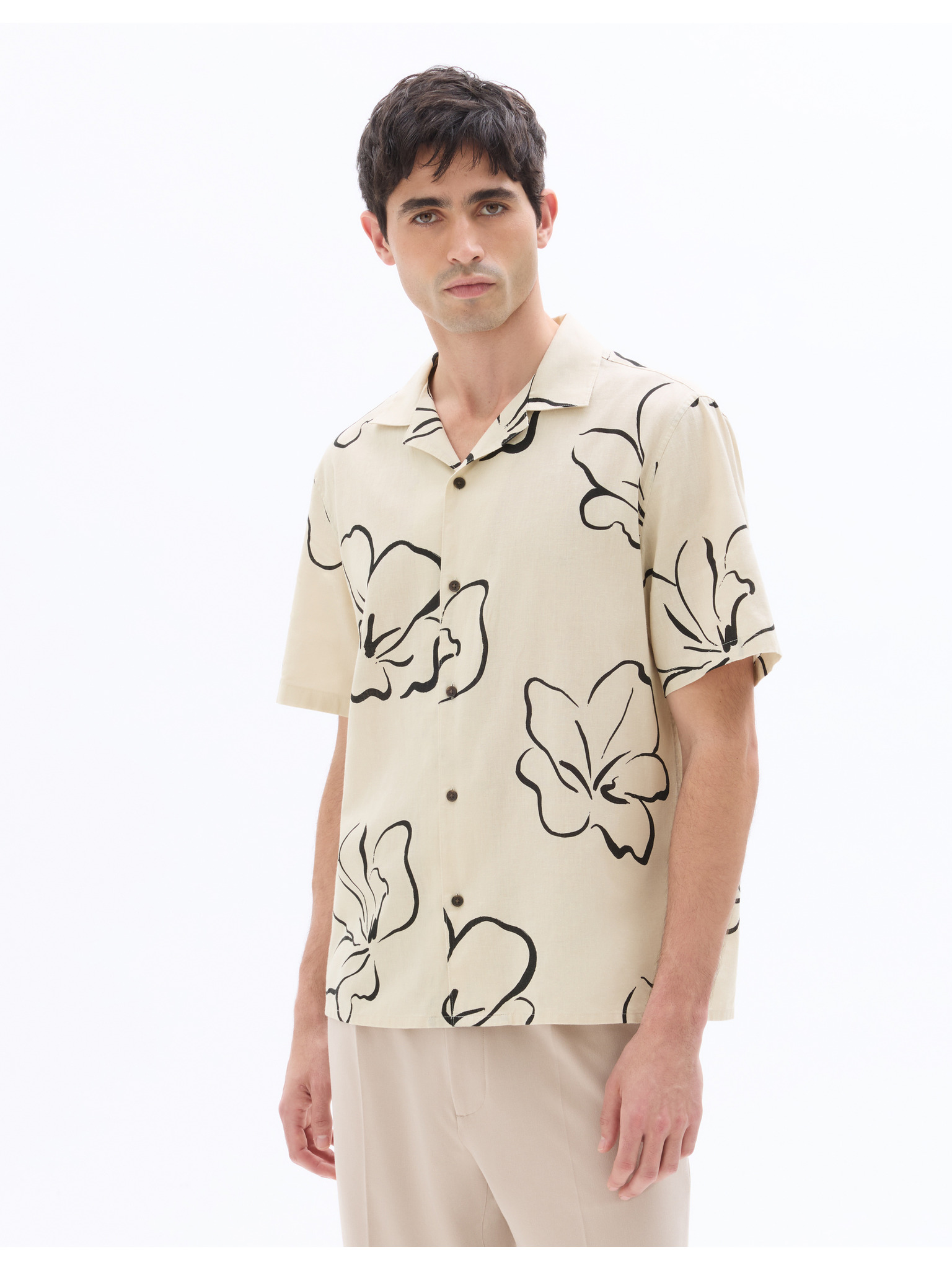 Pánská košile s krátkým rukávem a kubánským límcem béžová Ombre Clothing